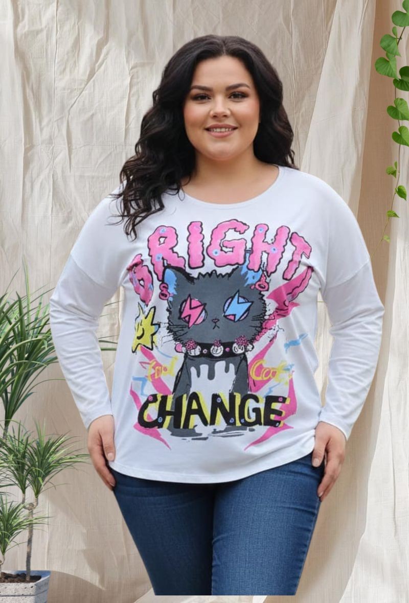 Camiseta básica de tejido súper suave, con cuello redondo y manga larga. Diseño con estampado delantero y parte trasera lisa, cómoda y fácil de combinar. Talla única grande, válida de 48 a 56.