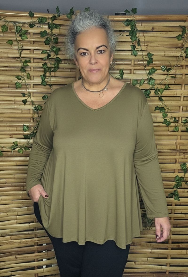 Camiseta básica con forma evasé, cómoda y muy favorecedora. Diseño con manga larga regulable con botón para recogerla fácilmente. Tejido muy elástico que cede y se adapta al cuerpo sin marcar. Disponible en diferentes colores.