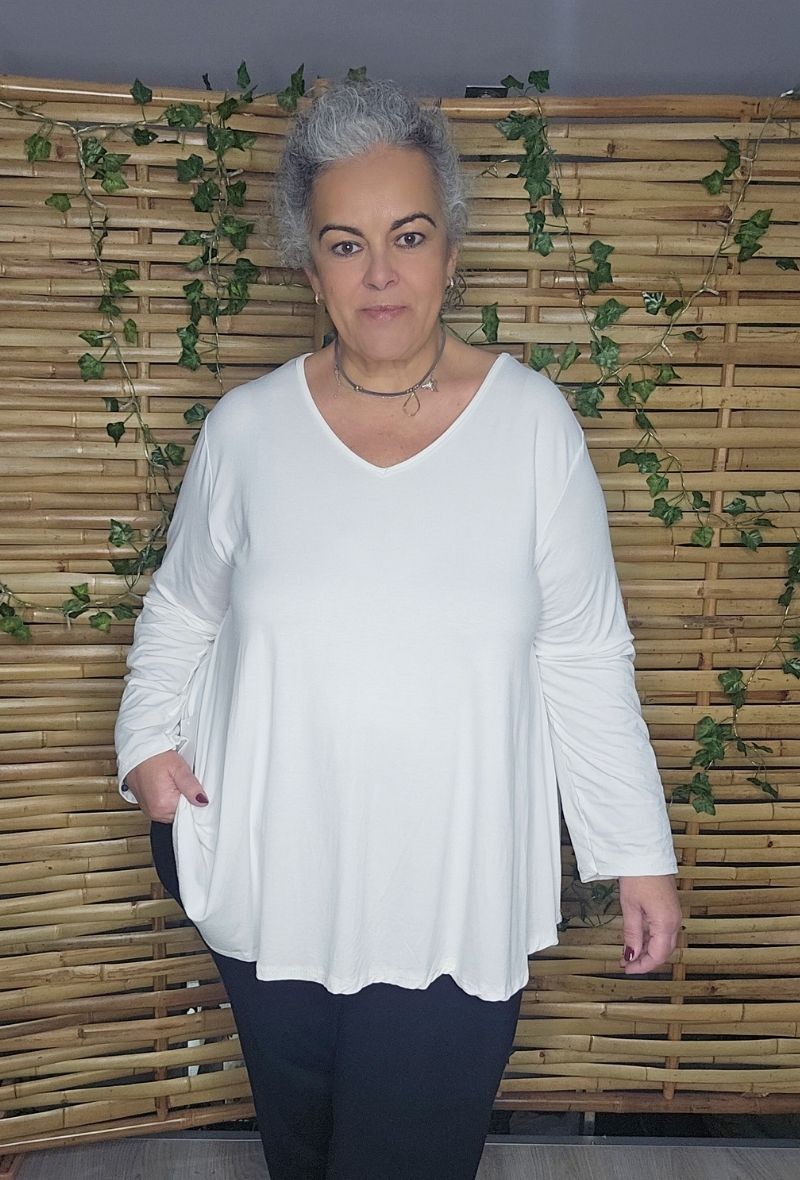 Camiseta básica con forma evasé, cómoda y muy favorecedora. Diseño con manga larga regulable con botón para recogerla fácilmente. Tejido muy elástico que cede y se adapta al cuerpo sin marcar. Disponible en diferentes colores.