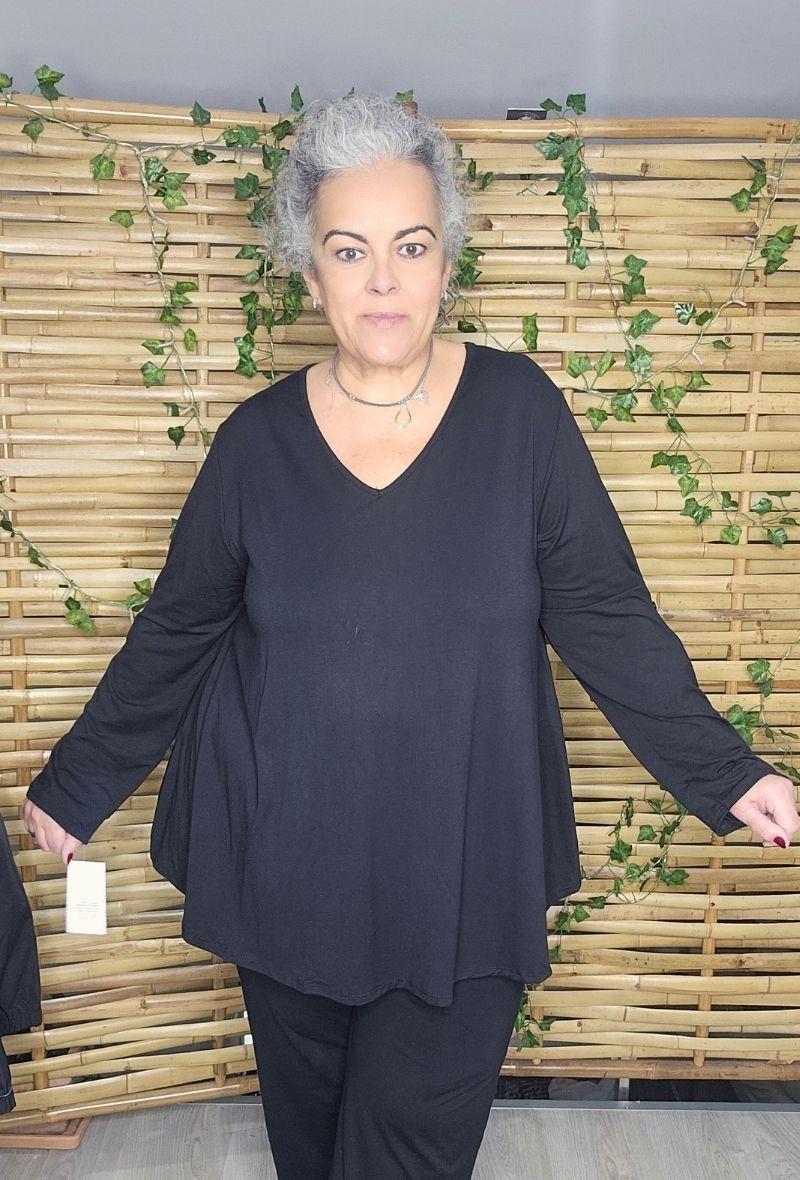 Camiseta básica con forma evasé, cómoda y muy favorecedora. Diseño con manga larga regulable con botón para recogerla fácilmente. Tejido muy elástico que cede y se adapta al cuerpo sin marcar. Disponible en diferentes colores.