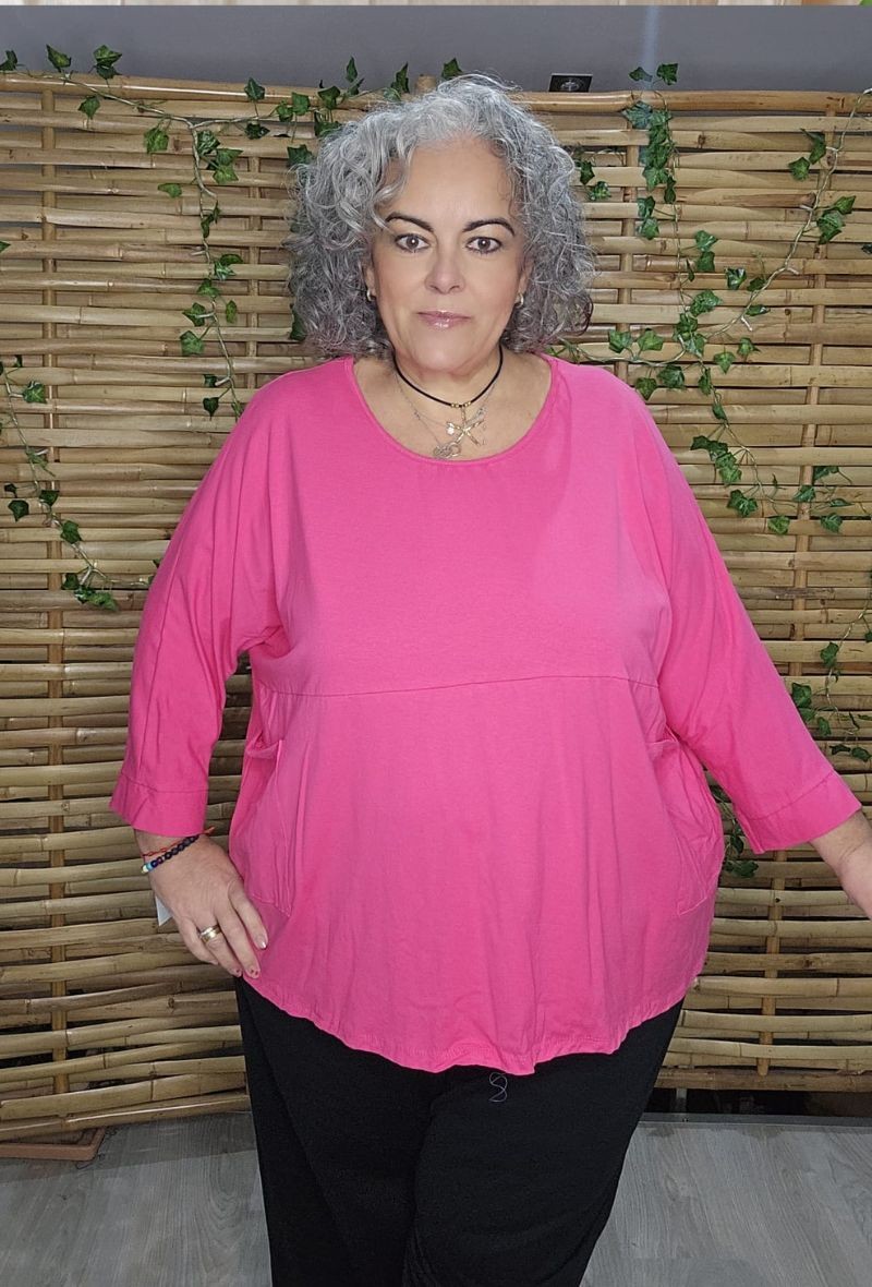 Camiseta de algodón, con diseño oversize y corte amplio, muy cómoda y favorecedora. Manga amplia estilo murciélago y caída fluida que estiliza sin marcar.