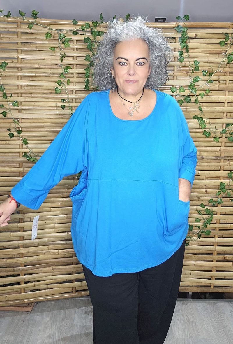 Camiseta de algodón, con diseño oversize y corte amplio, muy cómoda y favorecedora. Manga amplia estilo murciélago y caída fluida que estiliza sin marcar.