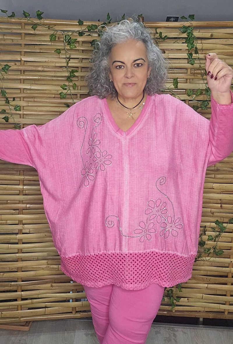 Túnica de algodón en dos tejidos, con cuello en V y estampado floral con pedrería en contraste. Parte delantera en crepé de algodón con bajo de ganchillo, espalda y mangas en punto elástico ligeramente desteñido. Corte holgado con hombros caídos, muy favorecedor.