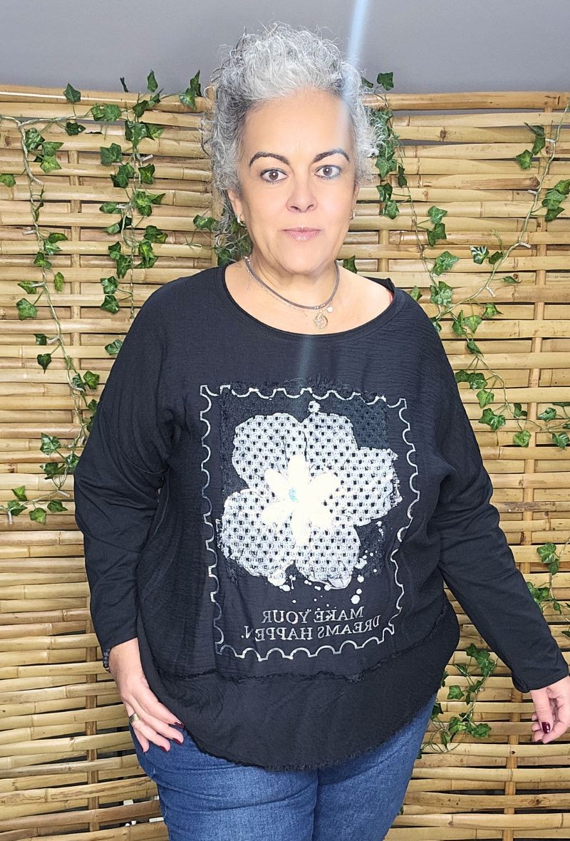 Camiseta de algodón con combinación de tejidos, con detalle de flor central y bajo en ganchillo que aporta un estilo original y femenino. Diseño cómodo y favorecedor, ideal para el día a día. Disponible en diferentes colores.