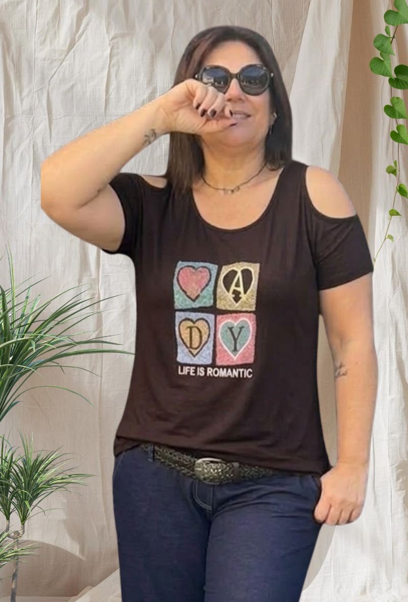 Camiseta de manga corta con detalle en los hombros descubiertos y estampación frontal de corazones en contraste. Diseño cómodo y actual con tejido suave y buena caída. Perfecta para looks casual con un toque diferente y favorecedor.
