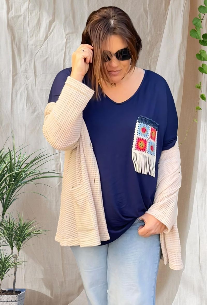 Camiseta de viscosa suave con manga corta y cuello en pico favorecedor. Destaca su detalle de bolsillo decorativo en contraste que aporta un toque original y diferente. Tejido ligero con buena caída, ideal para looks cómodos y versátiles.