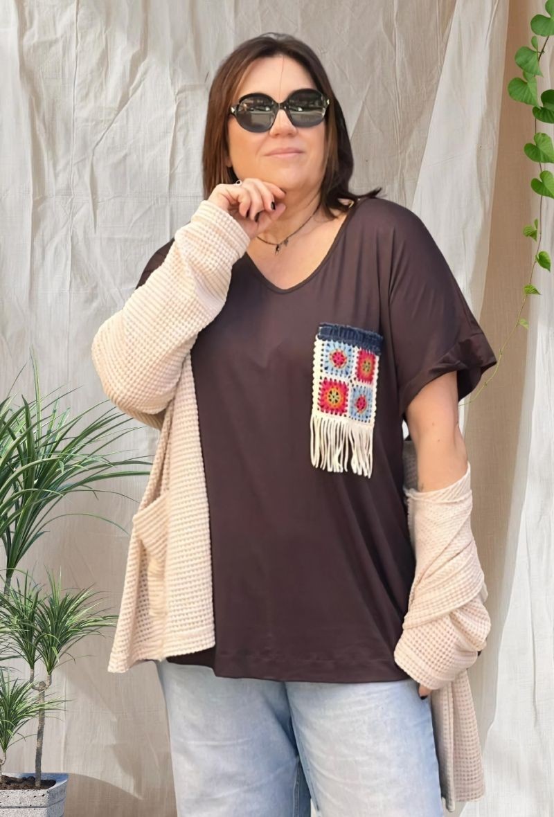 Camiseta de viscosa suave con manga corta y cuello en pico favorecedor. Destaca su detalle de bolsillo decorativo en contraste que aporta un toque original y diferente. Tejido ligero con buena caída, ideal para looks cómodos y versátiles.