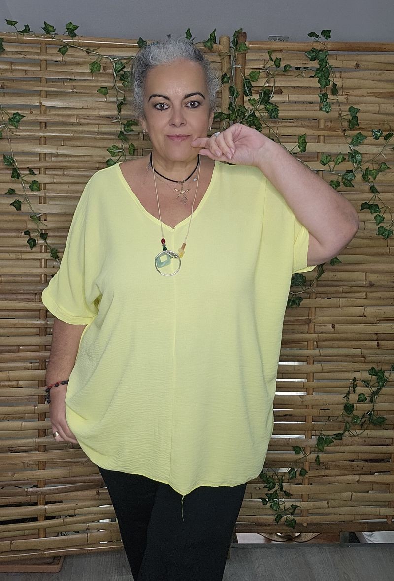Camiseta fluida de manga corta con corte amplio y cómodo. Diseño sencillo con cuello pico delante y atrás y tejido ligero que cae con suavidad y no marca. Un básico versátil ideal para combinar con pantalones, leggins o vaqueros.