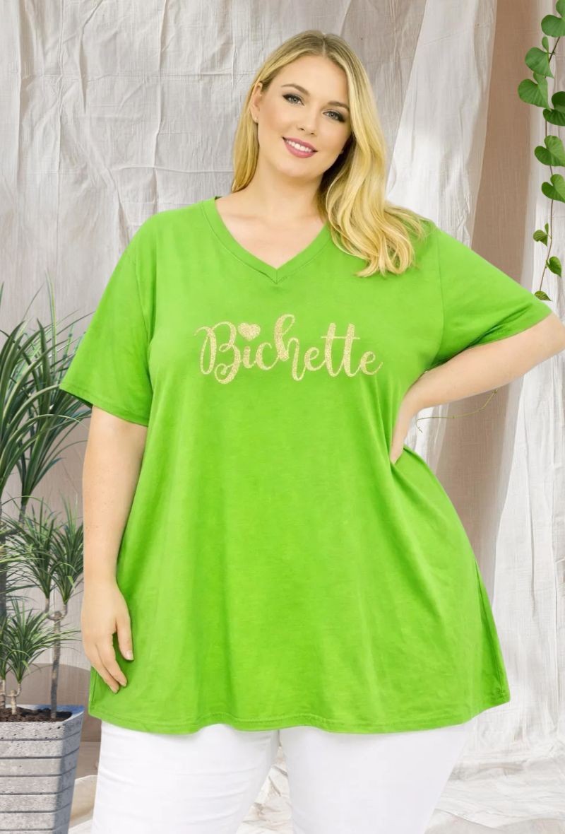 Camiseta extralarga de algodón elástico con cuello en V favorecedor y corte amplio. Destaca su estampado dorado brillante “Bichette” que aporta un toque moderno y original. Bajo ligeramente acampanado con caída relajada que estiliza y aporta comodidad.