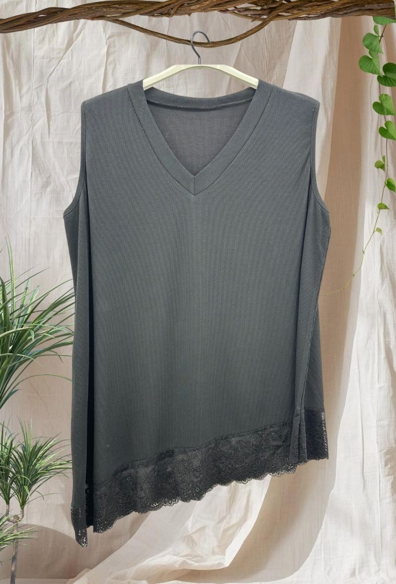 Top de punto fino con cuello en V y bajo con detalle de encaje que aporta un toque femenino. Ligero, cómodo y con caída fluida que no marca.