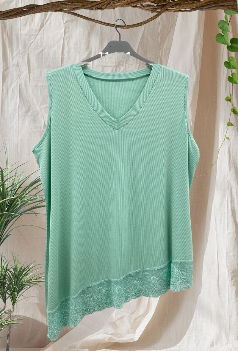 Top de punto fino con cuello en V y bajo con detalle de encaje que aporta un toque femenino. Ligero, cómodo y con caída fluida que no marca.