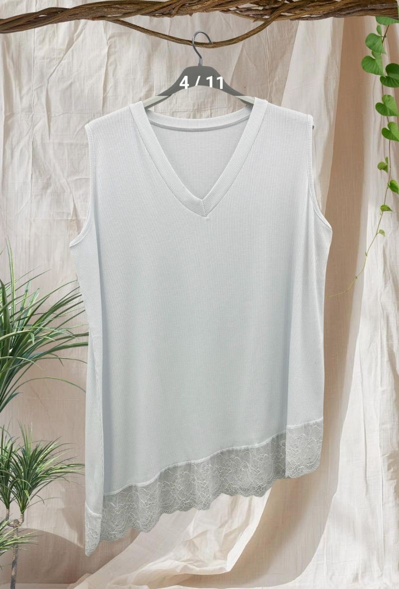 Top de punto fino con cuello en V y bajo con detalle de encaje que aporta un toque femenino. Ligero, cómodo y con caída fluida que no marca.