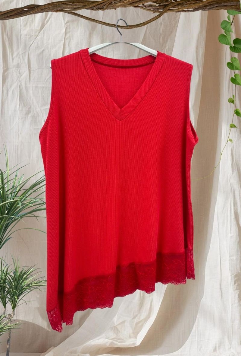 Top de punto fino con cuello en V y bajo con detalle de encaje que aporta un toque femenino. Ligero, cómodo y con caída fluida que no marca.