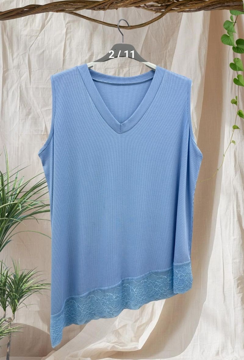 Top de punto fino con cuello en V y bajo con detalle de encaje que aporta un toque femenino. Ligero, cómodo y con caída fluida que no marca.