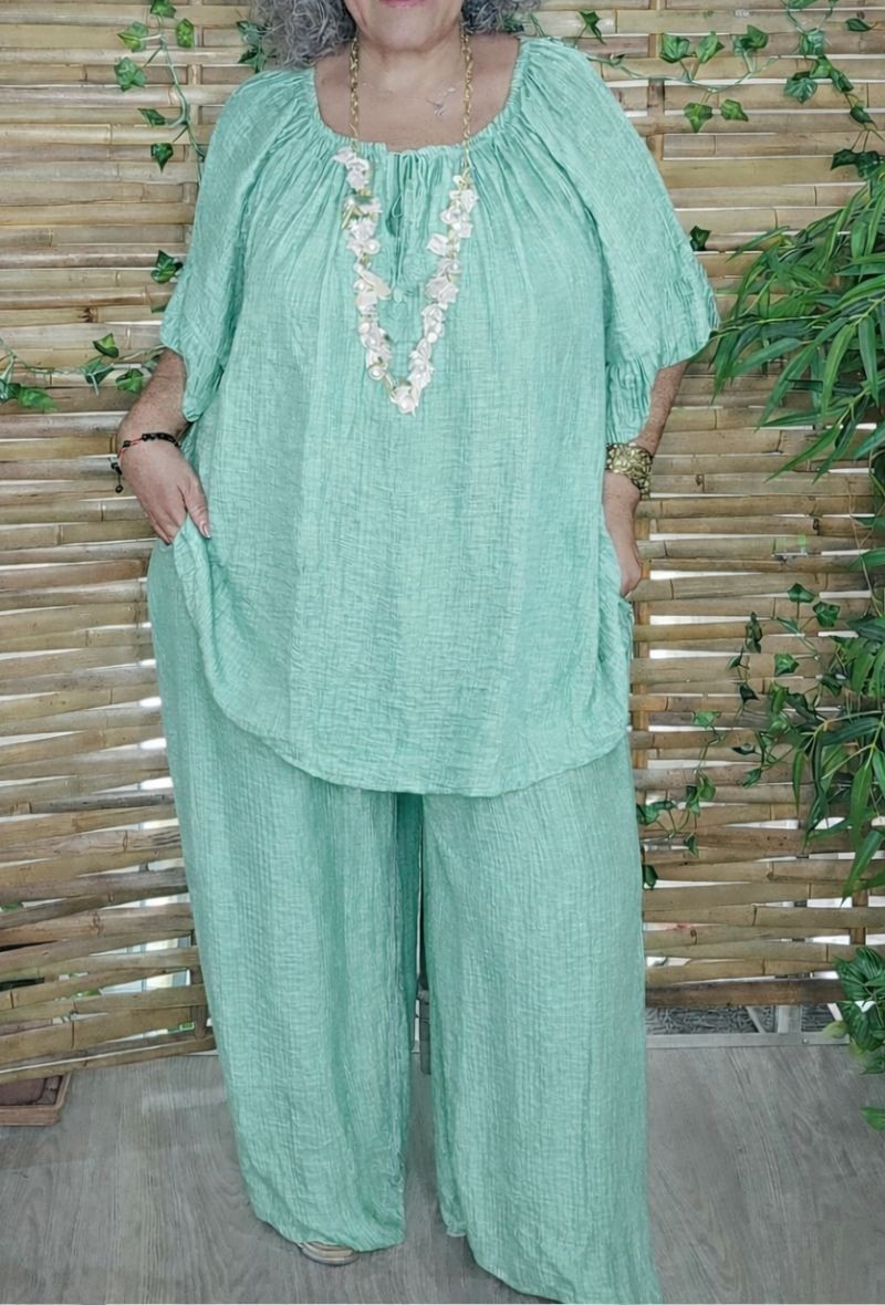 Blusa fluida con tejido de textura arrugada muy ligero y cómodo. Diseño amplio con escote redondeado ligeramente fruncido y manga corta amplia que aporta movimiento y frescura. Prenda versátil que puede llevarse sola o combinada con el pantalón a juego para crear un look completo.