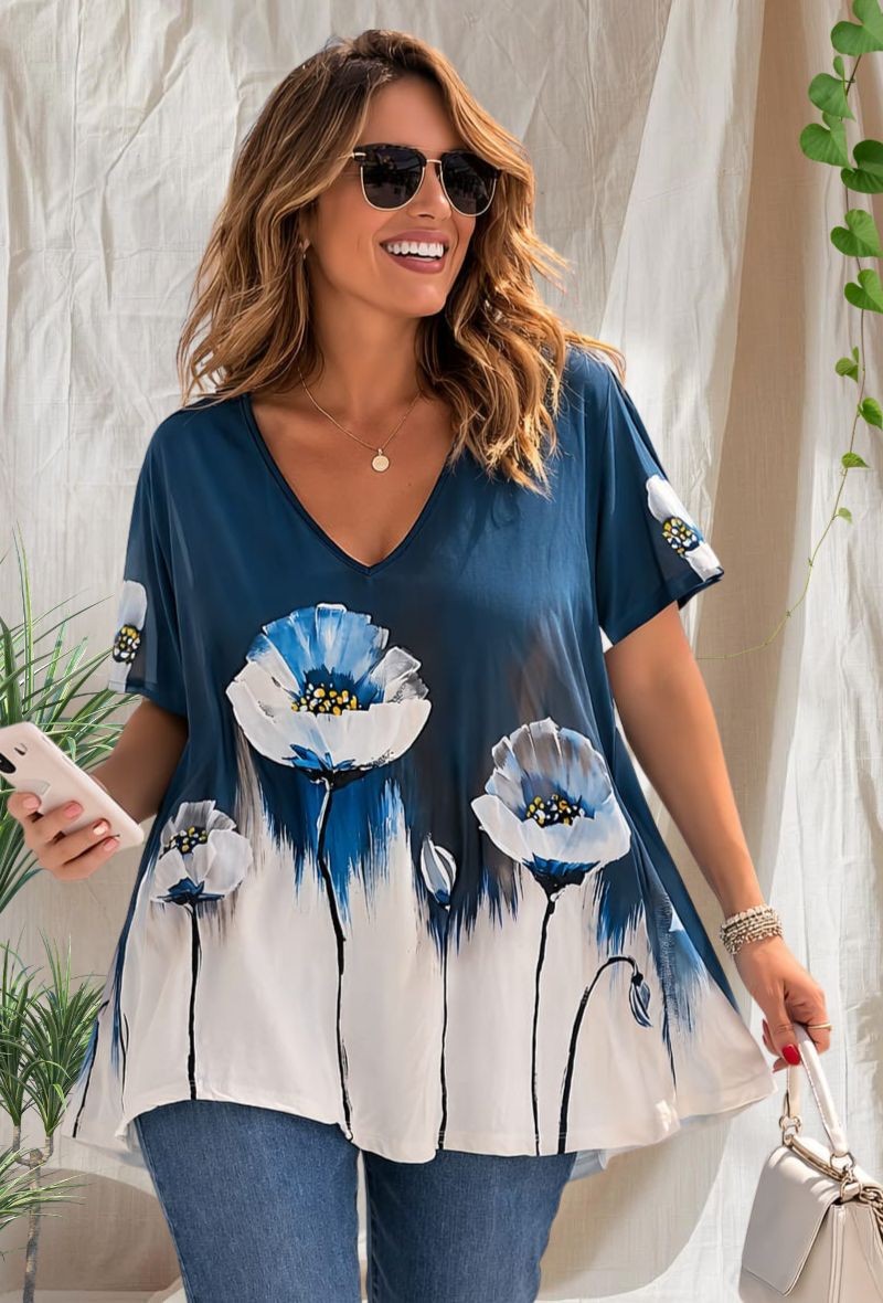 Camiseta de punto frío con estampado divertidos y caída fluida. Tejido ligero, fresco y con mucha elasticidad que se adapta perfectamente al cuerpo sin marcar.