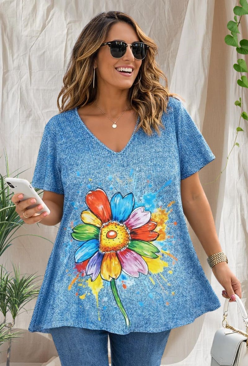 Camiseta de punto frío con estampado divertidos y caída fluida. Tejido ligero, fresco y con mucha elasticidad que se adapta perfectamente al cuerpo sin marcar.