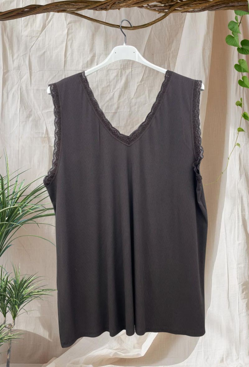 Top de punto fino con cuello en V con detalle de encaje en mangas y cuello que aporta un toque femenino. Ligero, cómodo y con caída fluida que no marca.