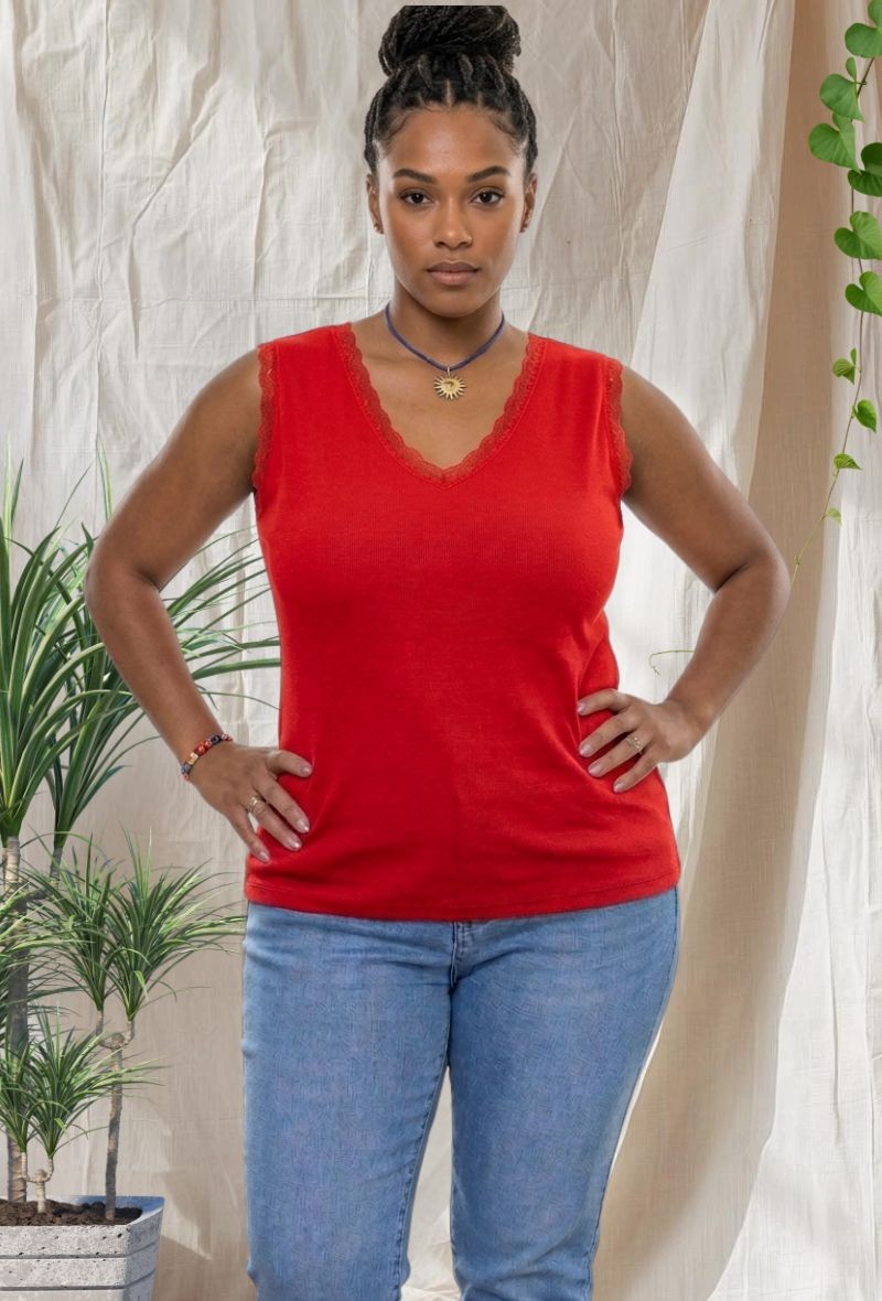 Top de punto fino con cuello en V con detalle de encaje en mangas y cuello que aporta un toque femenino. Ligero, cómodo y con caída fluida que no marca.