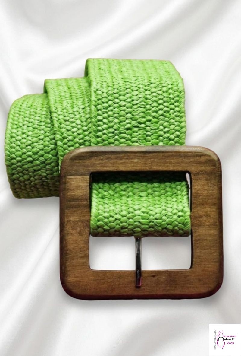 Cinturón elástico ancho con hebilla cuadrada en madera.