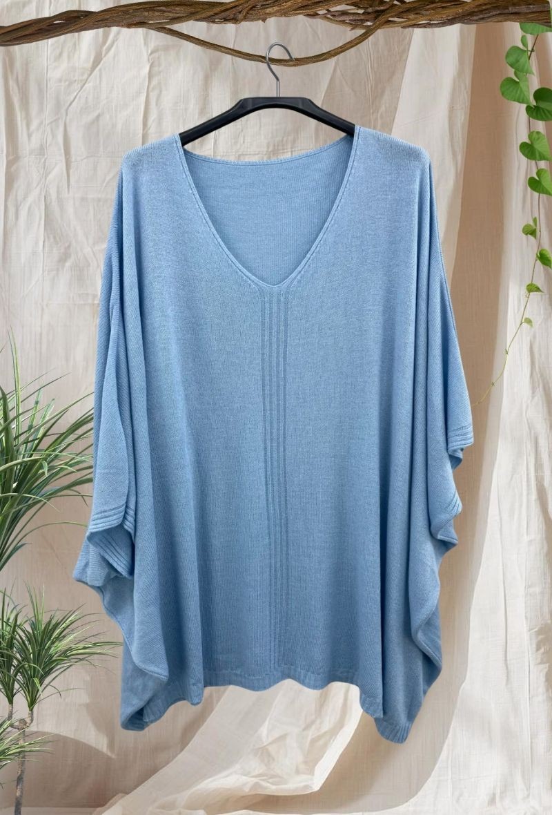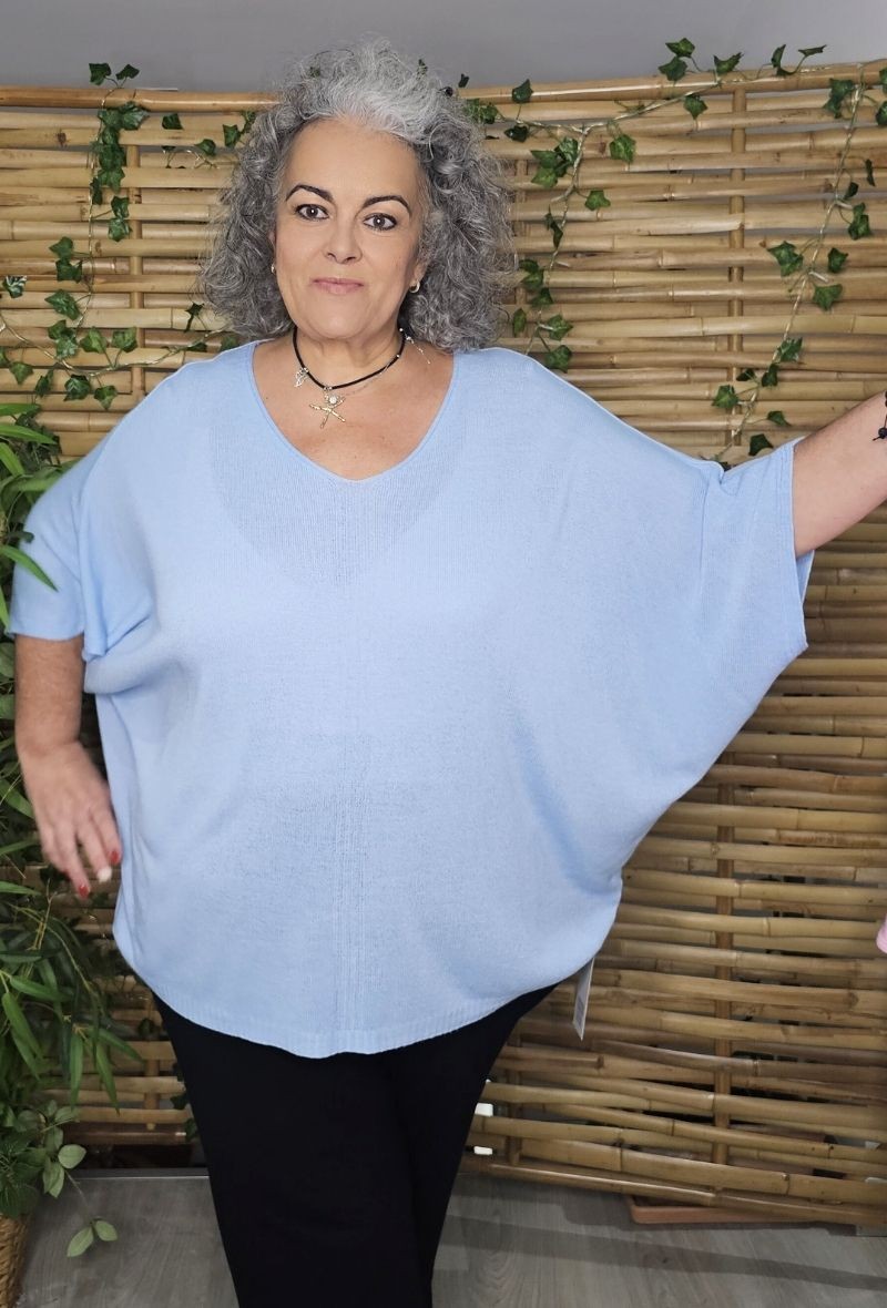 Jersey de punto muy fino y suave con escote en pico y corte amplio tipo murciélago. Ligero, cómodo y con caída fluida que estiliza sin marcar. Perfecto para looks relajados y elegantes.