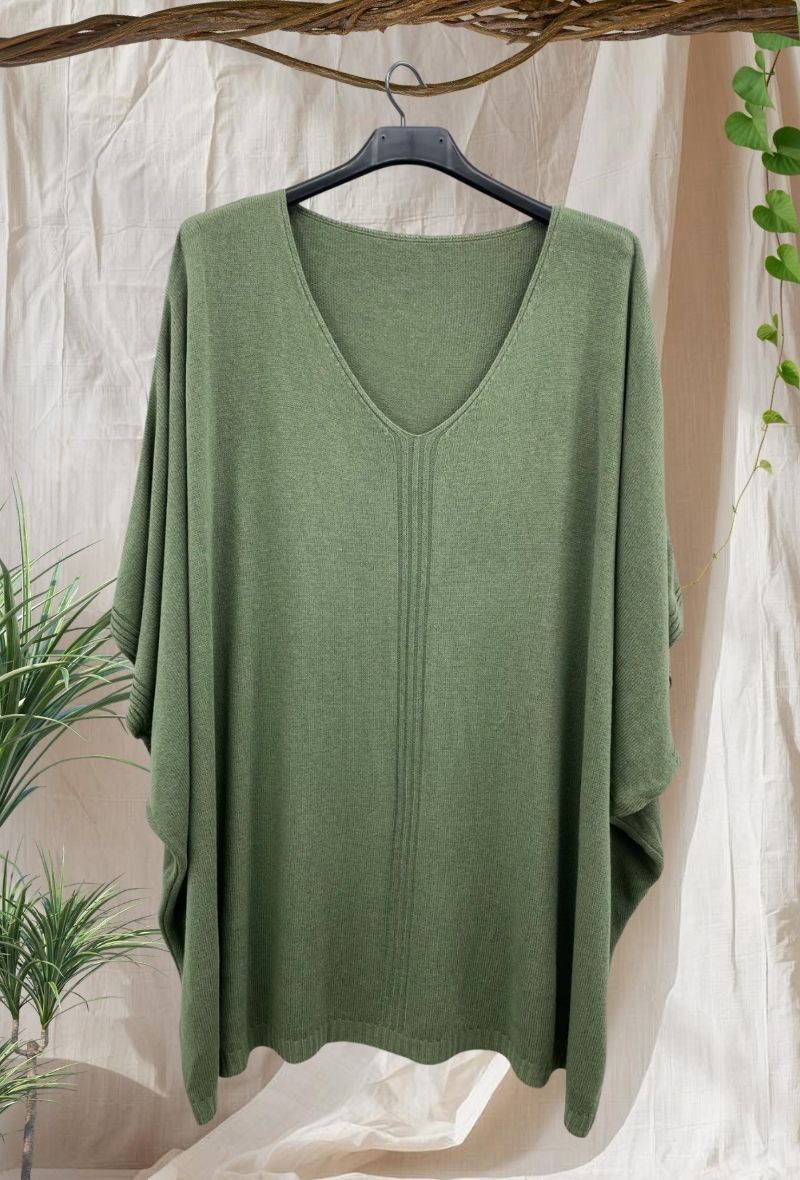 Jersey de punto muy fino y suave con escote en pico y corte amplio tipo murciélago. Ligero, cómodo y con caída fluida que estiliza sin marcar. Perfecto para looks relajados y elegantes.