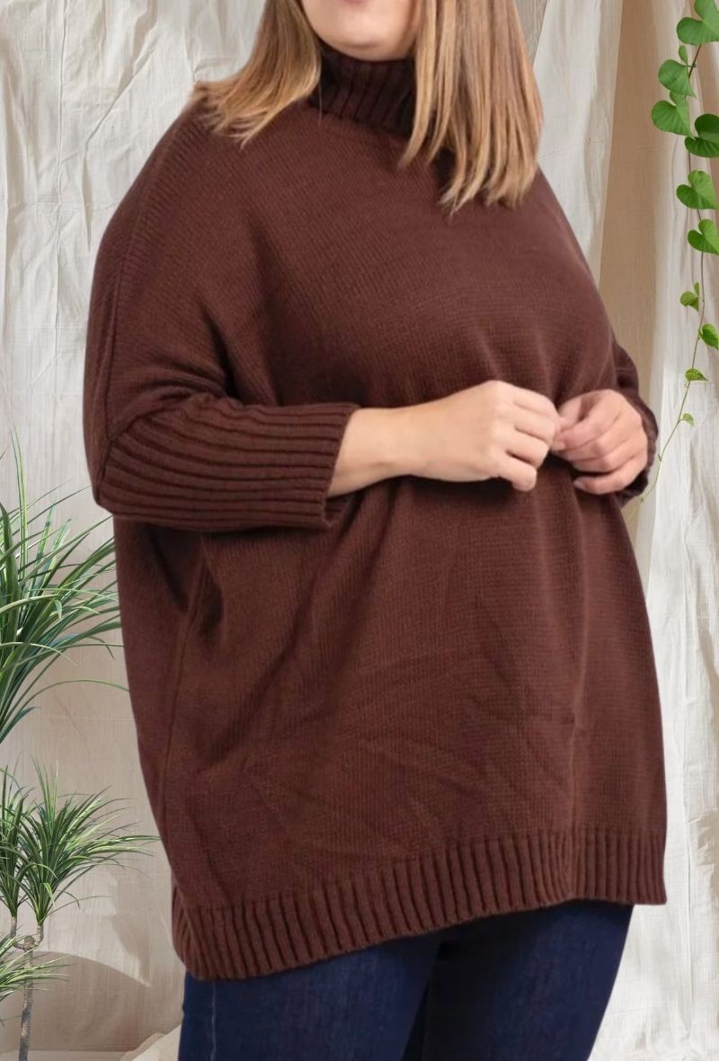Jersey oversize cuadrado, cuello alto, punto gordito y suave.