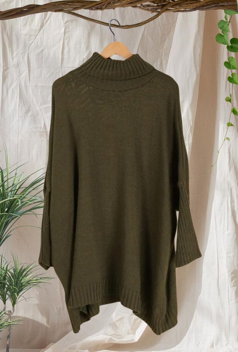 Jersey oversize cuadrado, cuello alto, punto gordito y suave.