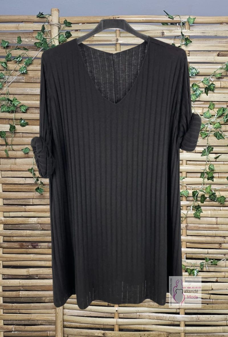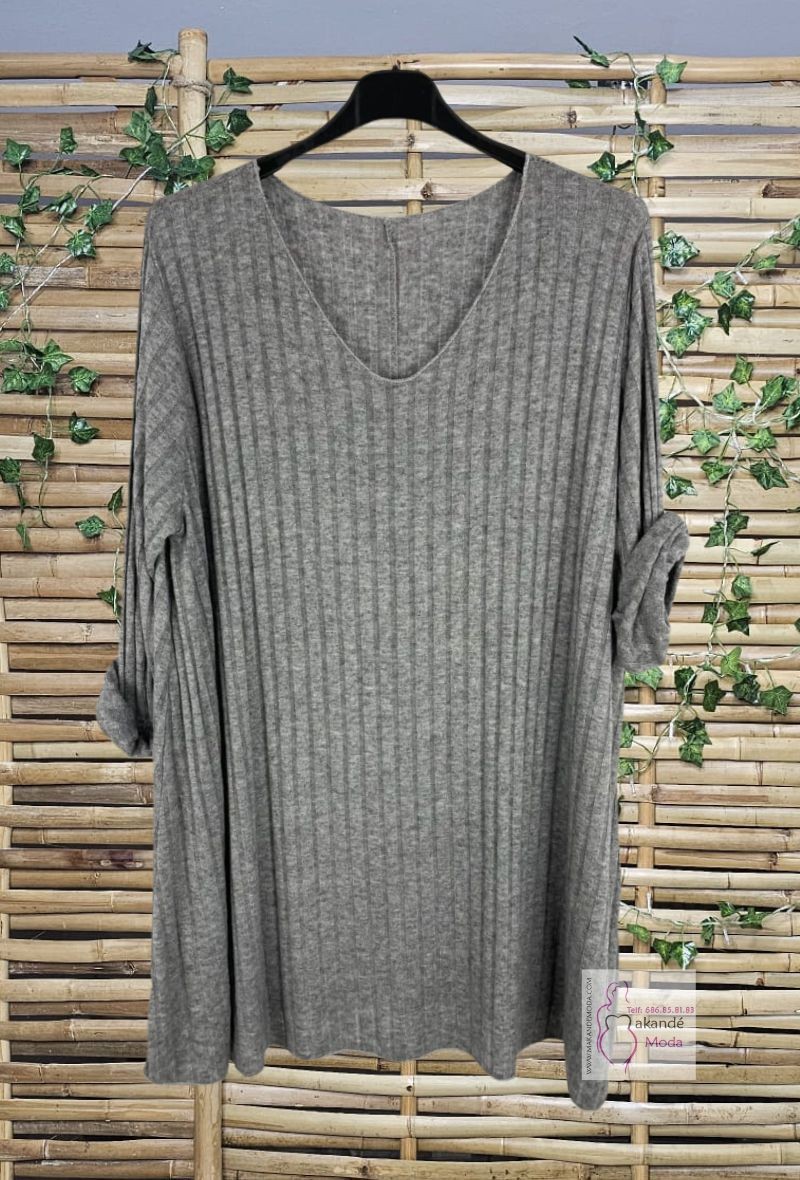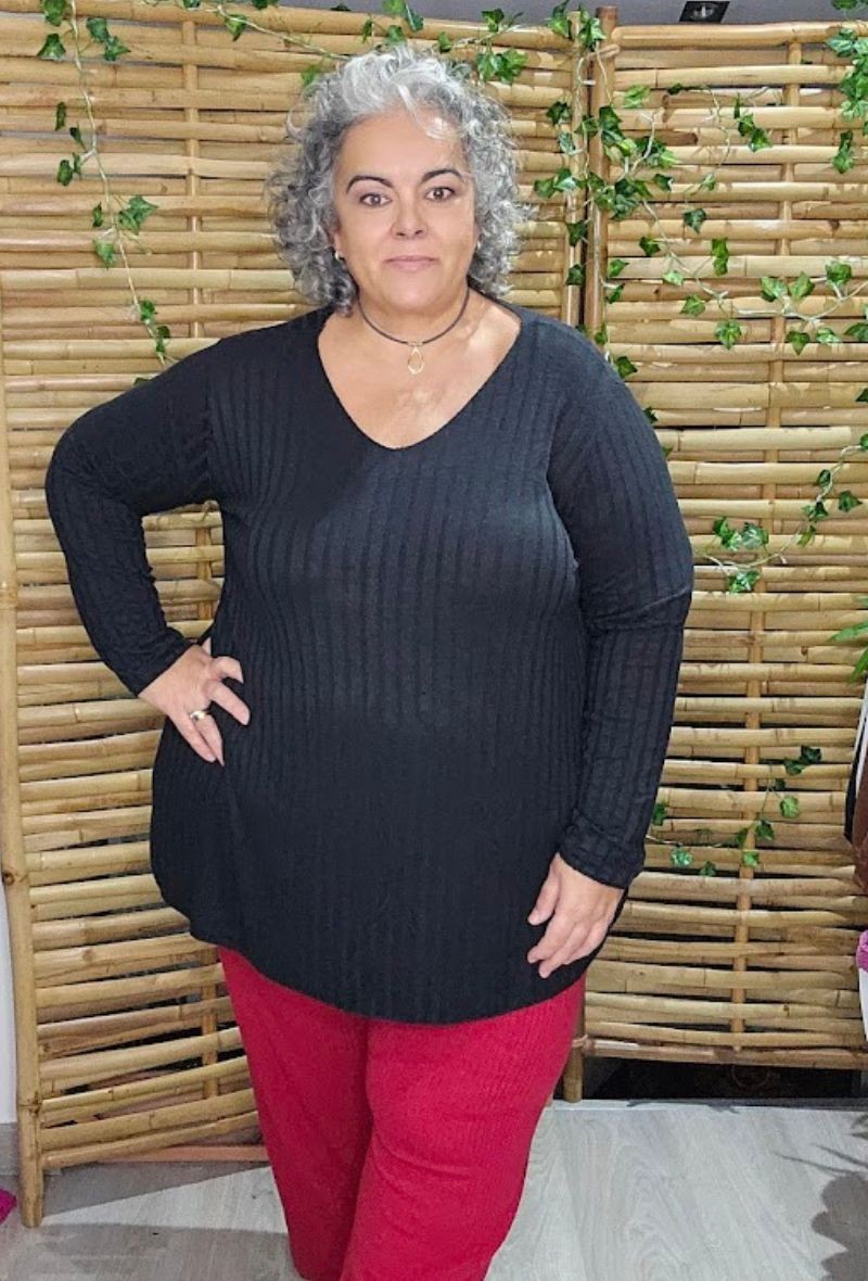 Jersey de punto elástico con cuello en pico y manga larga, cómodo y favorecedor. Su tejido canalé se adapta al cuerpo con una caída fluida.