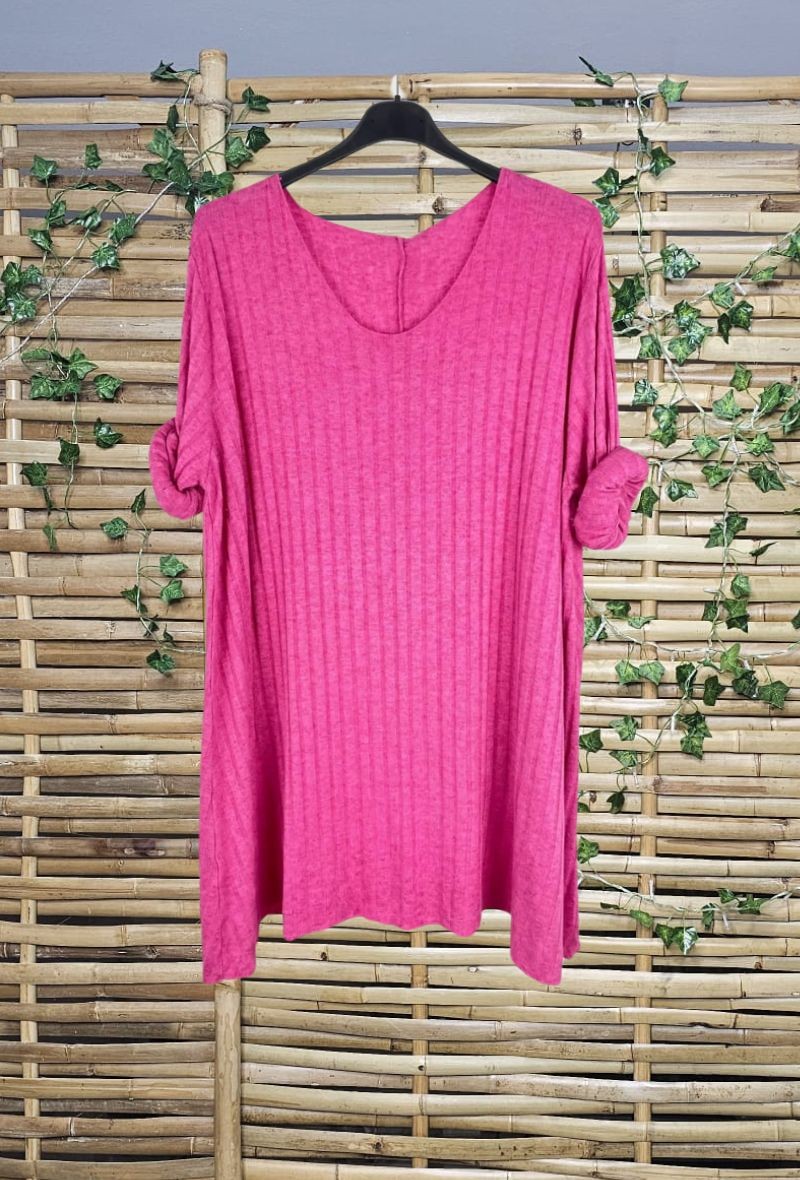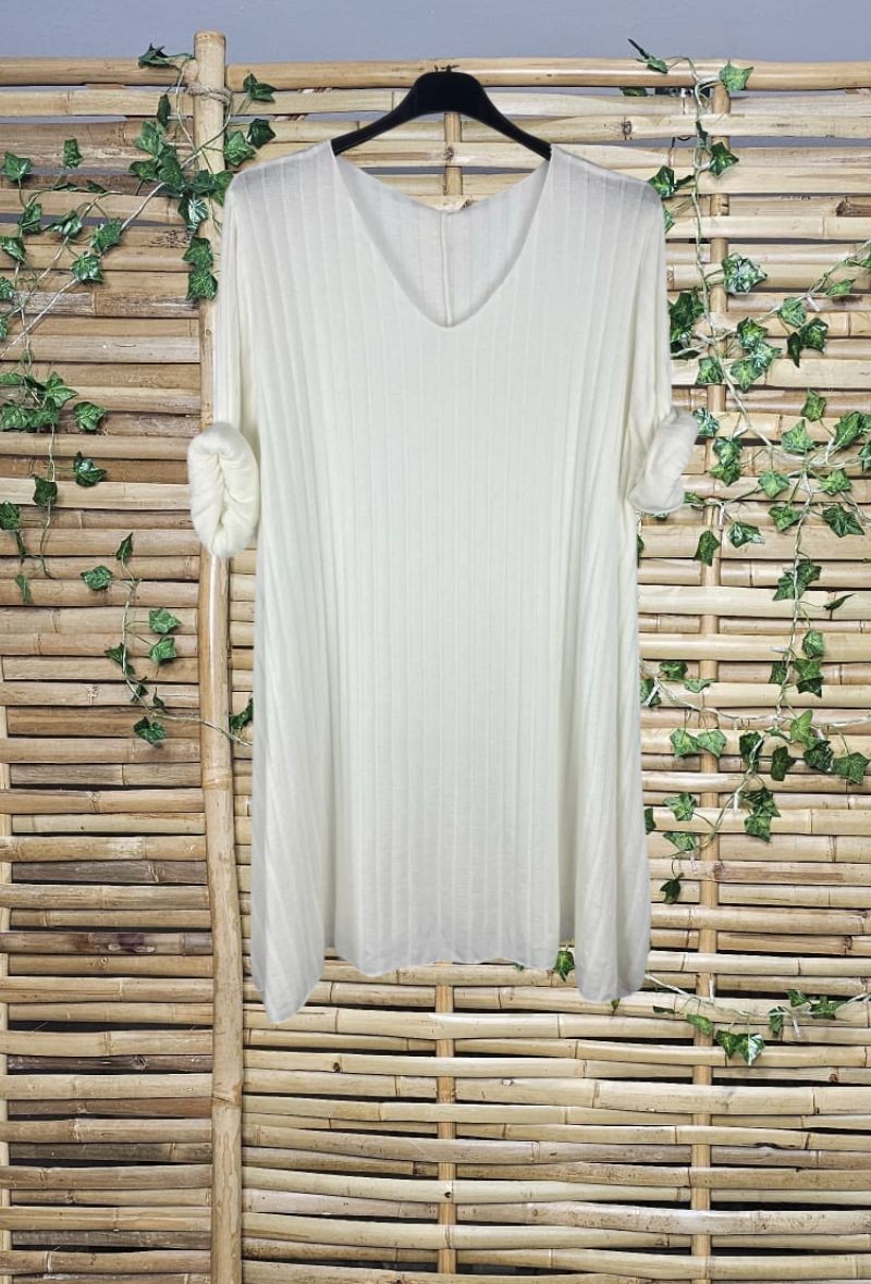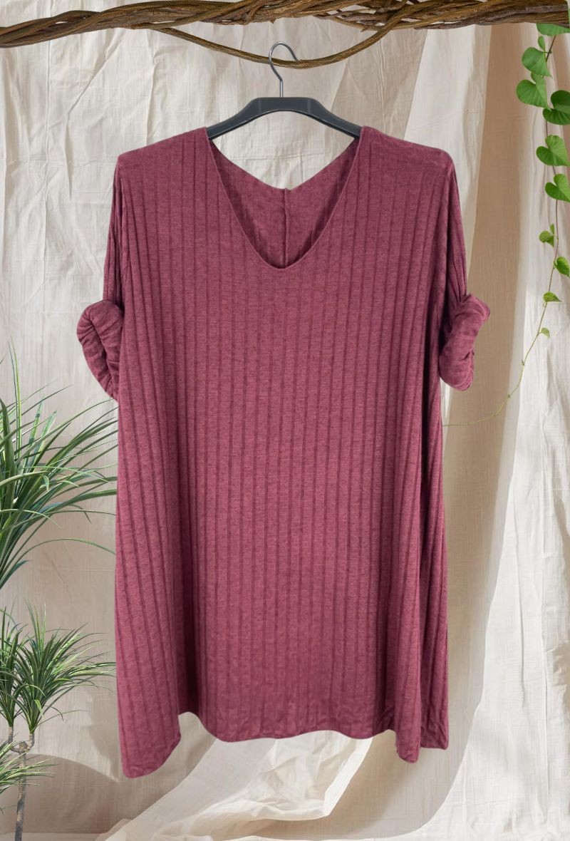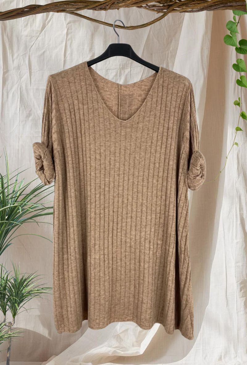 Jersey de punto elástico con cuello en pico y manga larga, cómodo y favorecedor. Su tejido canalé se adapta al cuerpo con una caída fluida.