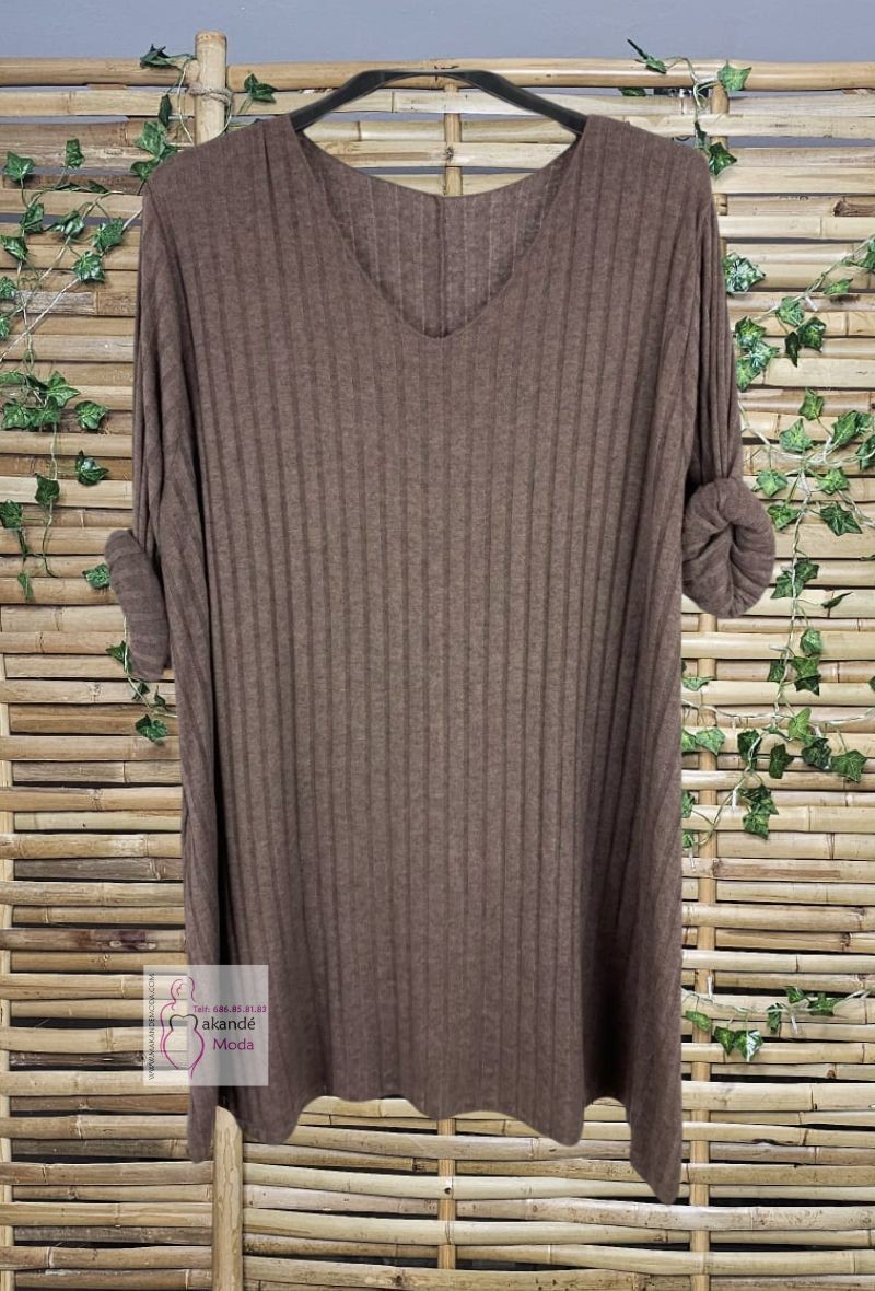 Jersey de punto elástico con cuello en pico y manga larga, cómodo y favorecedor. Su tejido canalé se adapta al cuerpo con una caída fluida.