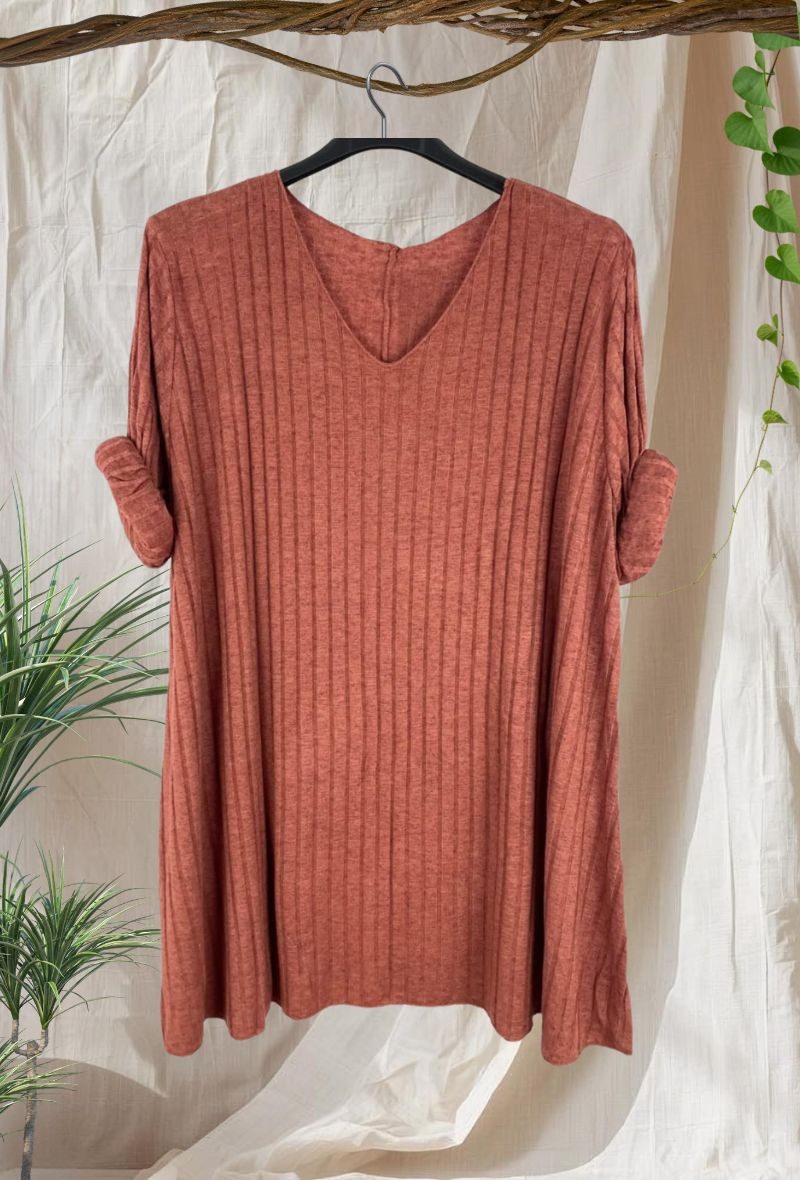 Jersey de punto elástico con cuello en pico y manga larga, cómodo y favorecedor. Su tejido canalé se adapta al cuerpo con una caída fluida.