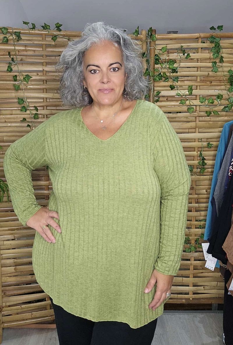 Jersey de punto elástico con cuello en pico y manga larga, cómodo y favorecedor. Su tejido canalé se adapta al cuerpo con una caída fluida.