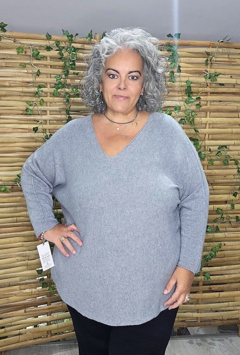 Jersey de punto muy suave, cuello en V y bajo redondeado, que aporta un toque favorecedor y moderno. Cómodo, ligero y adaptable a diferentes tallas.