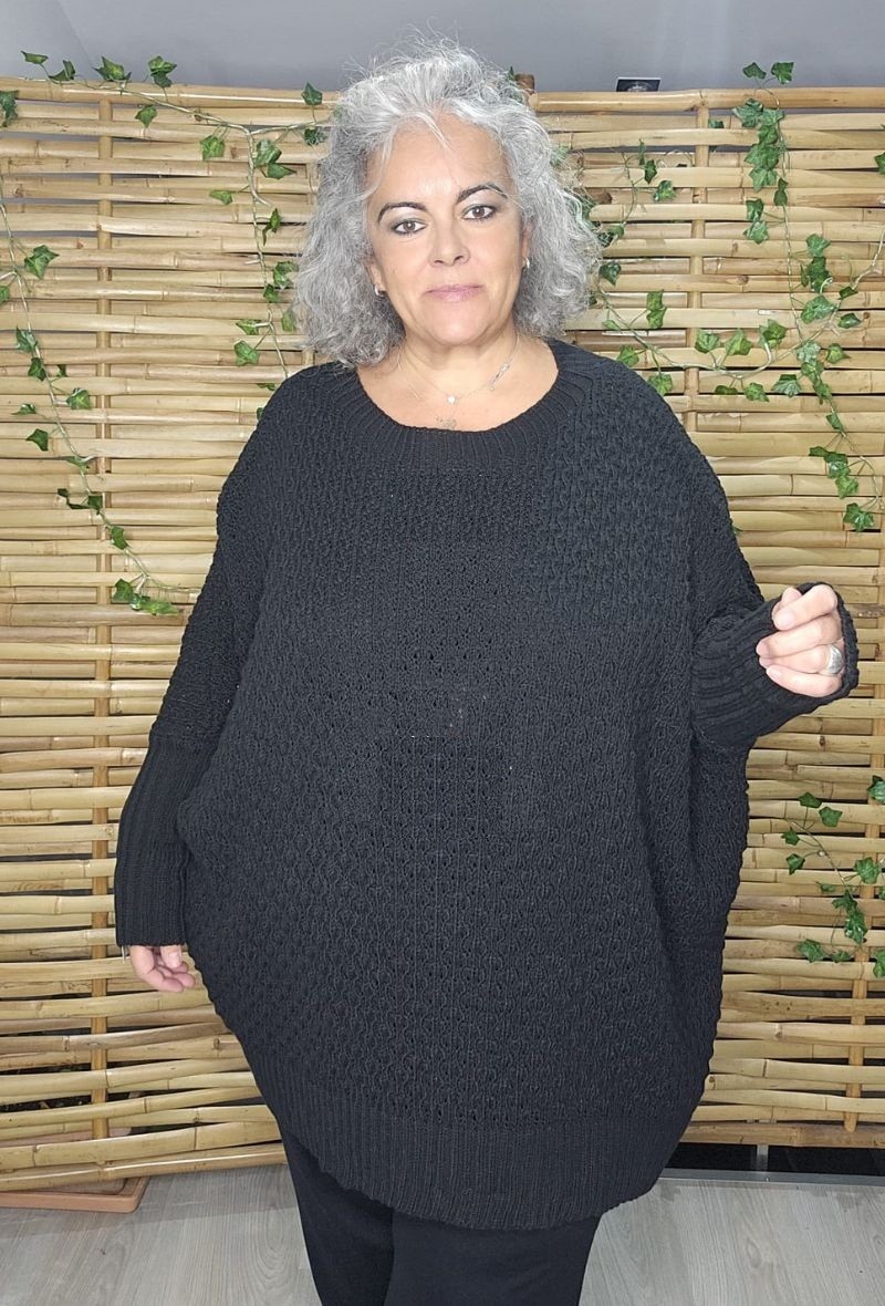 Jersey calado de punto trenzado, con cuello barco, mangas murciélago y corte cuadrado. Su tejido es calentito, suave y cómodo, ideal para un look moderno y favorecedor.