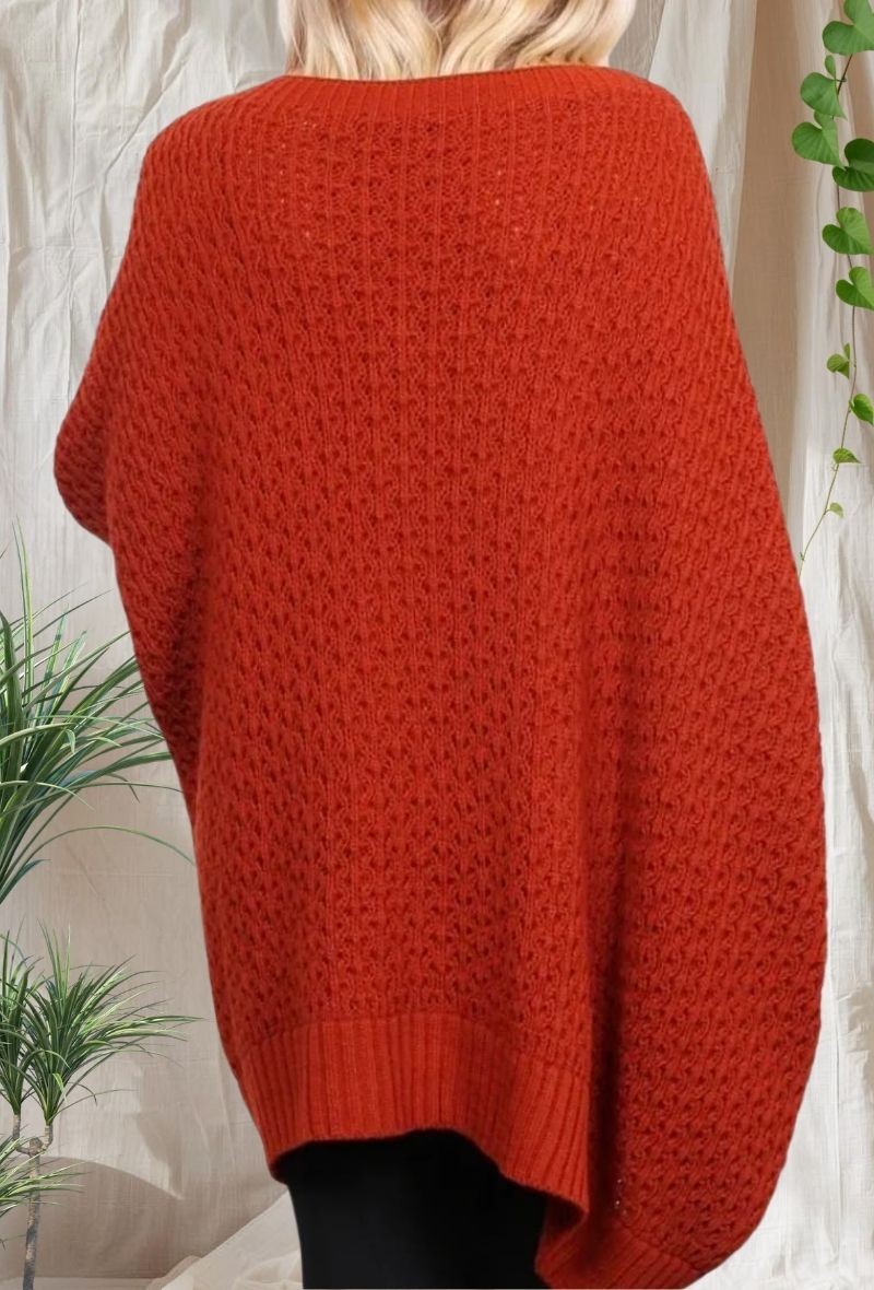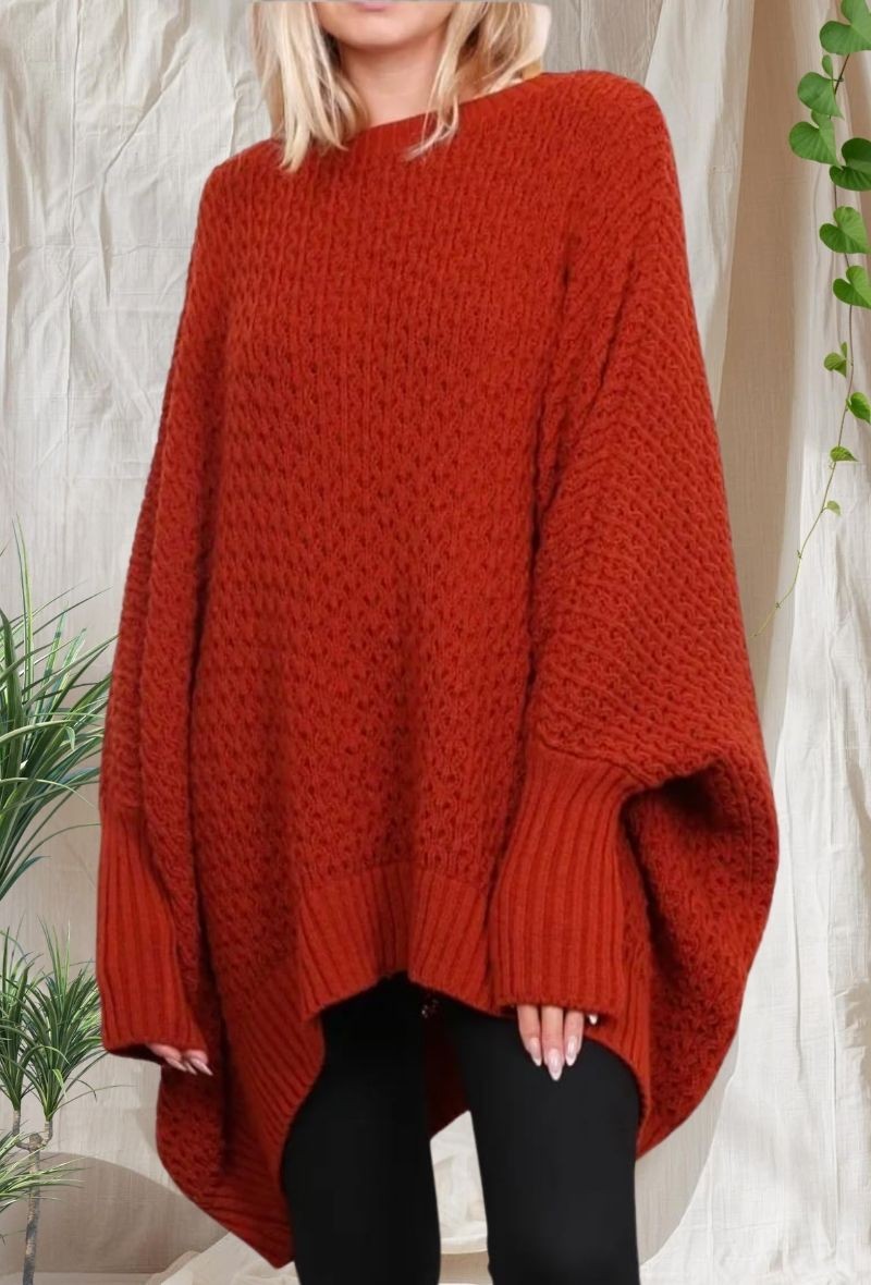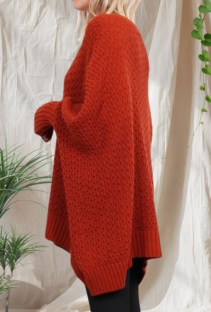 Jersey calado de punto trenzado, con cuello barco, mangas murciélago y corte cuadrado. Su tejido es calentito, suave y cómodo, ideal para un look moderno y favorecedor.