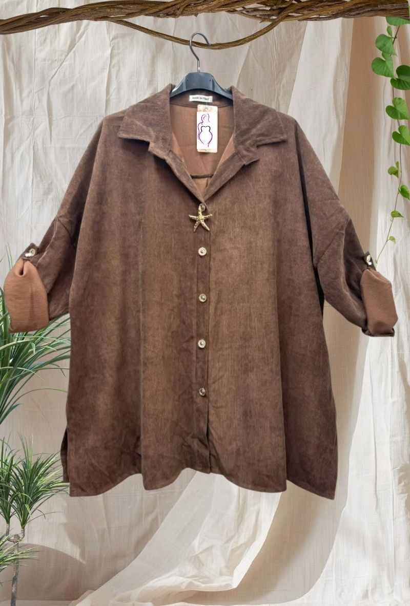 Camisa de pana fina (milleraie) con broche extraíble, mangas remangadas y pequeñas aberturas laterales. Lleva pliegue en la espalda para un extra de comodidad. Suave, elástica y perfecta para el día a día.