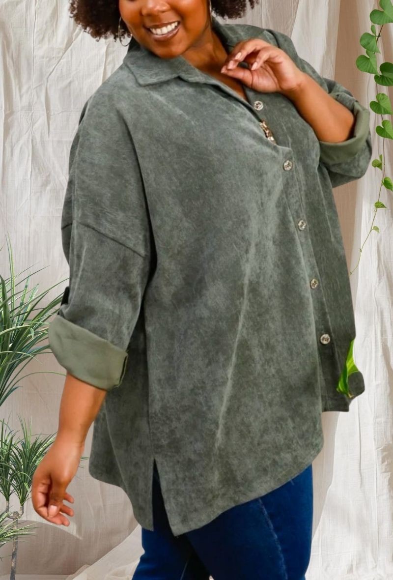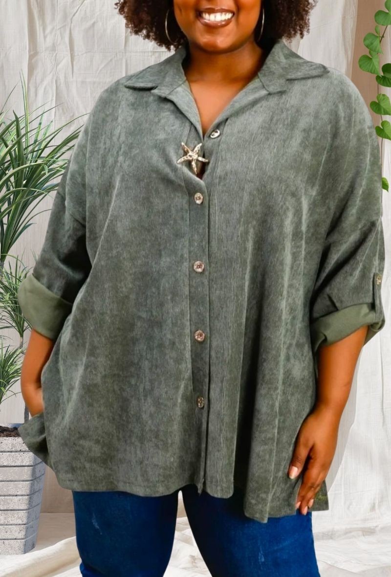Camisa de pana fina (milleraie) con broche extraíble, mangas remangadas y pequeñas aberturas laterales. Lleva pliegue en la espalda para un extra de comodidad. Suave, elástica y perfecta para el día a día.