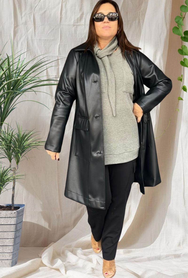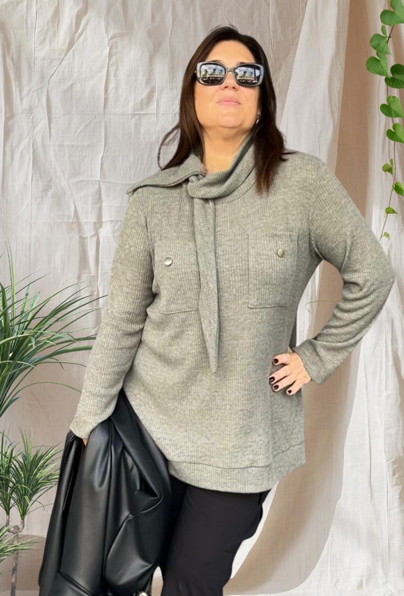 Jersey de punto canalé, con cuello suelto, bolsillos grandes delanteros y forma evasé. Suave, cómodo y con un diseño favorecedor para el día a día.