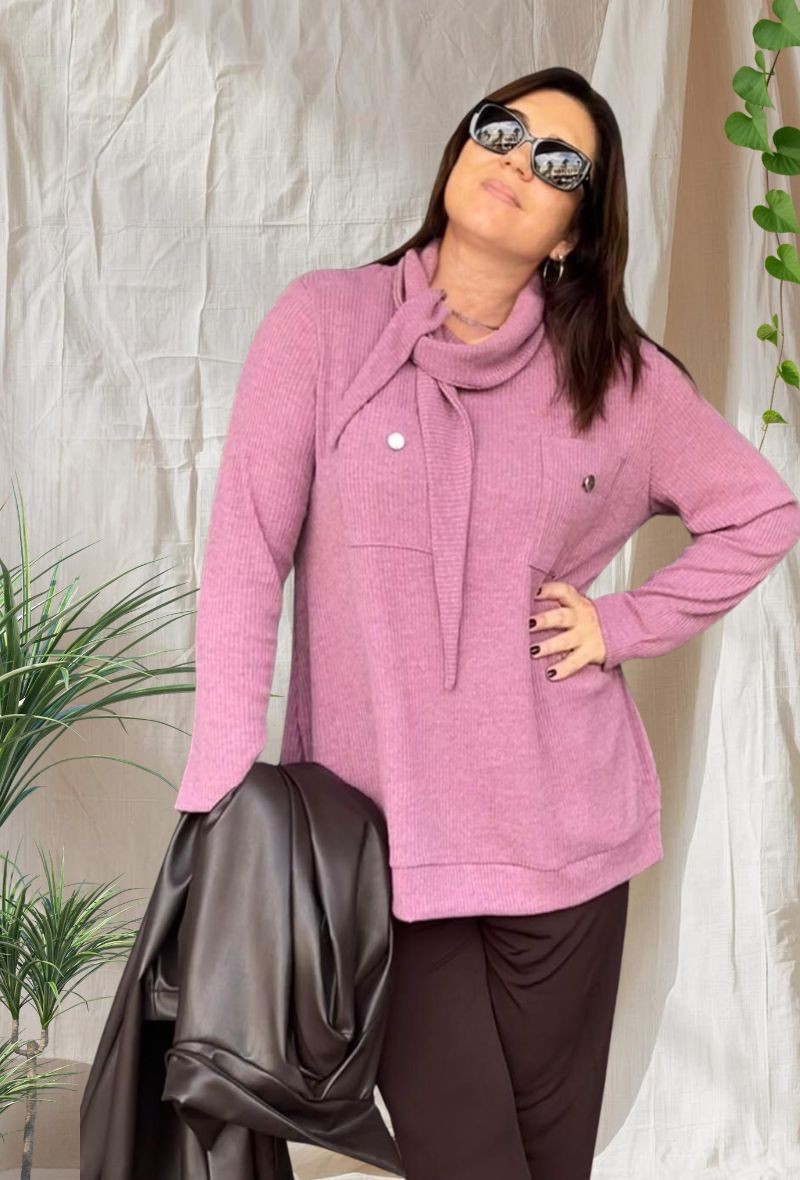 Jersey de punto canalé, con cuello suelto, bolsillos grandes delanteros y forma evasé. Suave, cómodo y con un diseño favorecedor para el día a día.