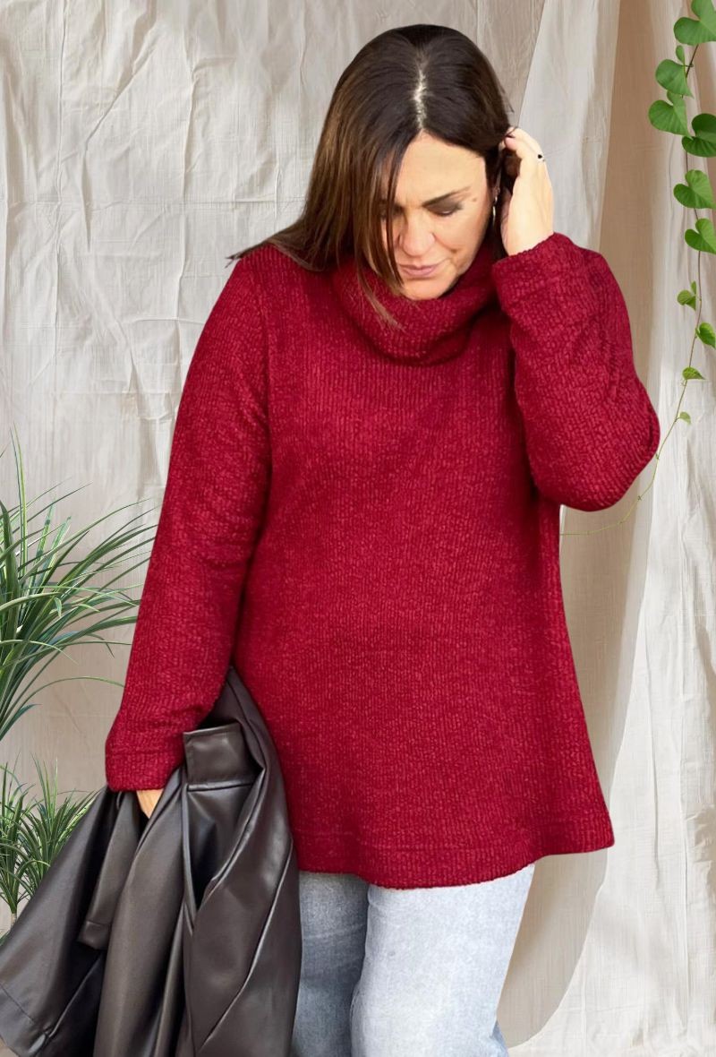 Jersey de punto canalé caliente, con cuello suelto, forma evasé.