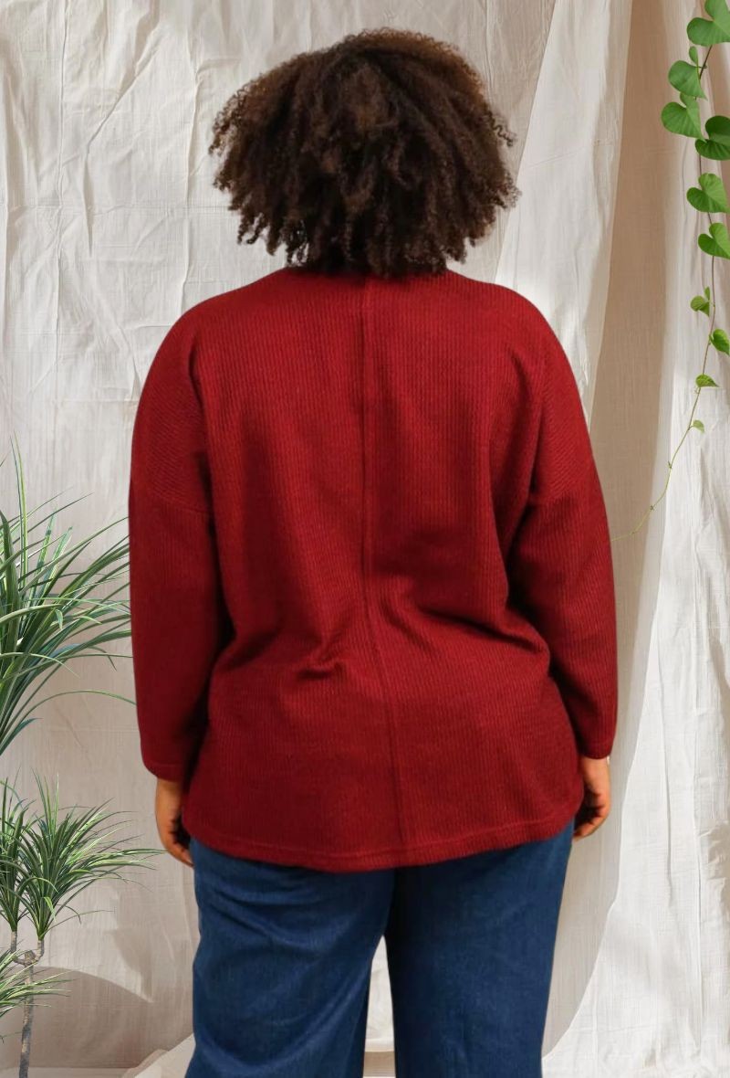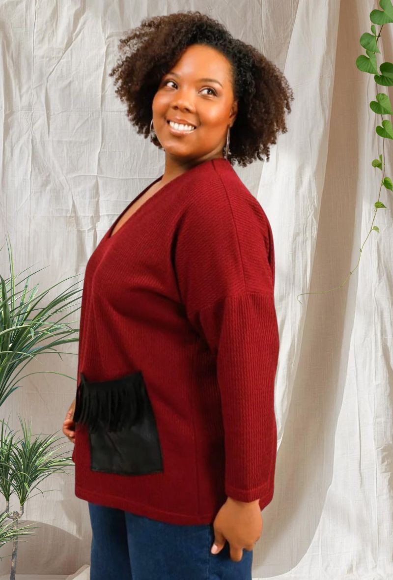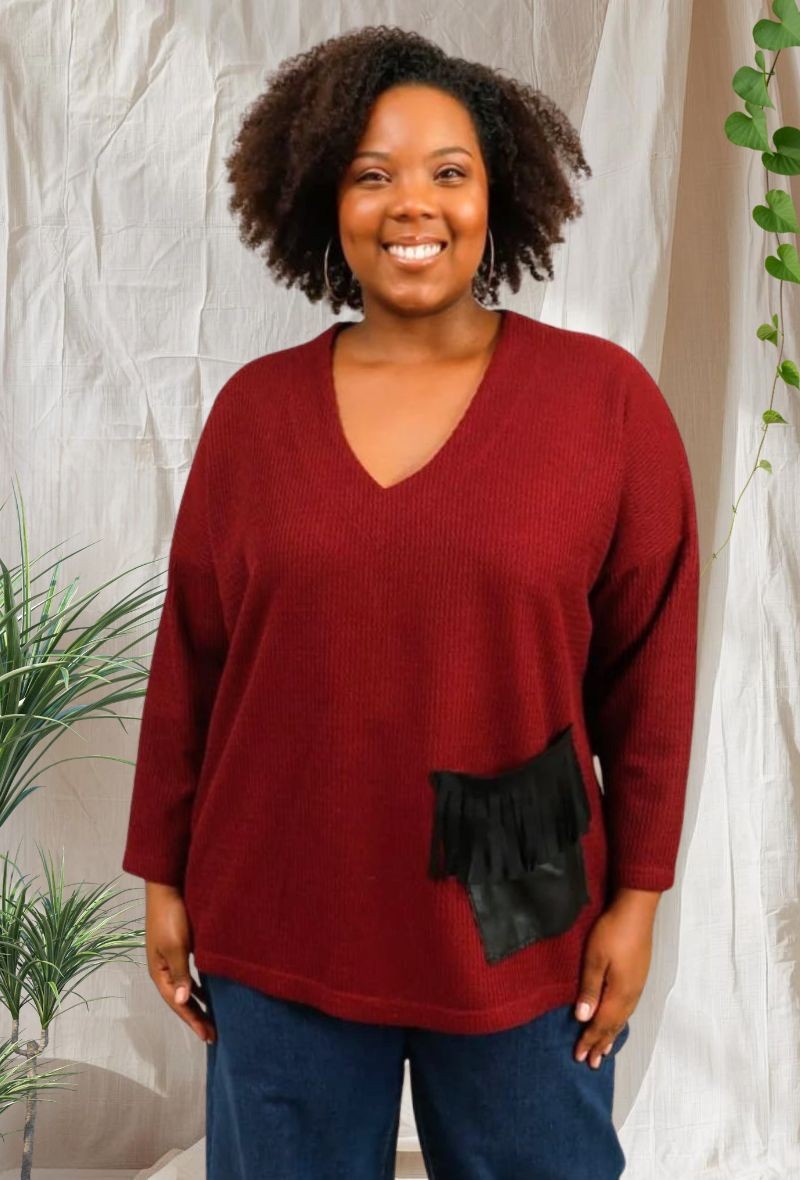 Sudadera de estilo bohemio, corte fluido, cuello en pico y mangas amplias. Lleva bolsillos delanteros con detalle de flecos que aportan un toque original y moderno