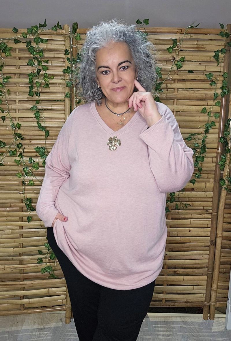 Sudadera de punto ultrasuave con cuello en V y forro polar interior, ideal para ir calentita y cómoda. Incluye broche dorado extraíble en la parte delantera para darle un toque especial.