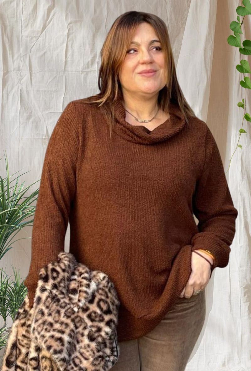 Jersey de punto canalé caliente, con cuello alto, forma evasé.