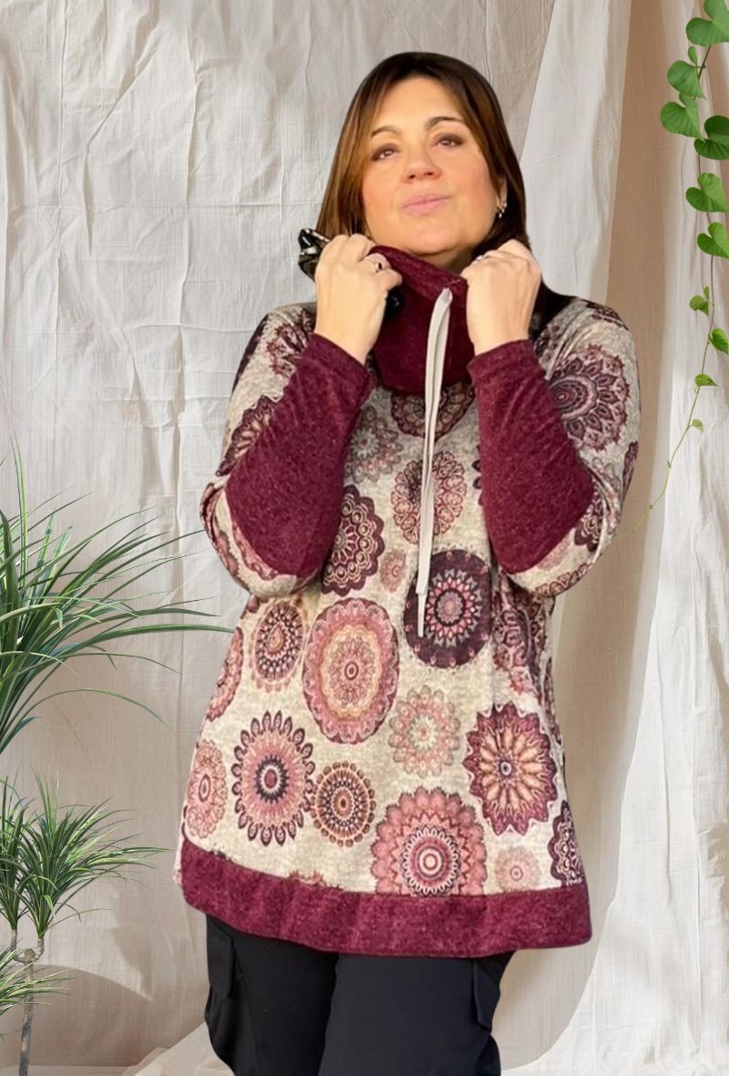 Jersey de punto canalé caliente, con cuello suelto, forma evasé.