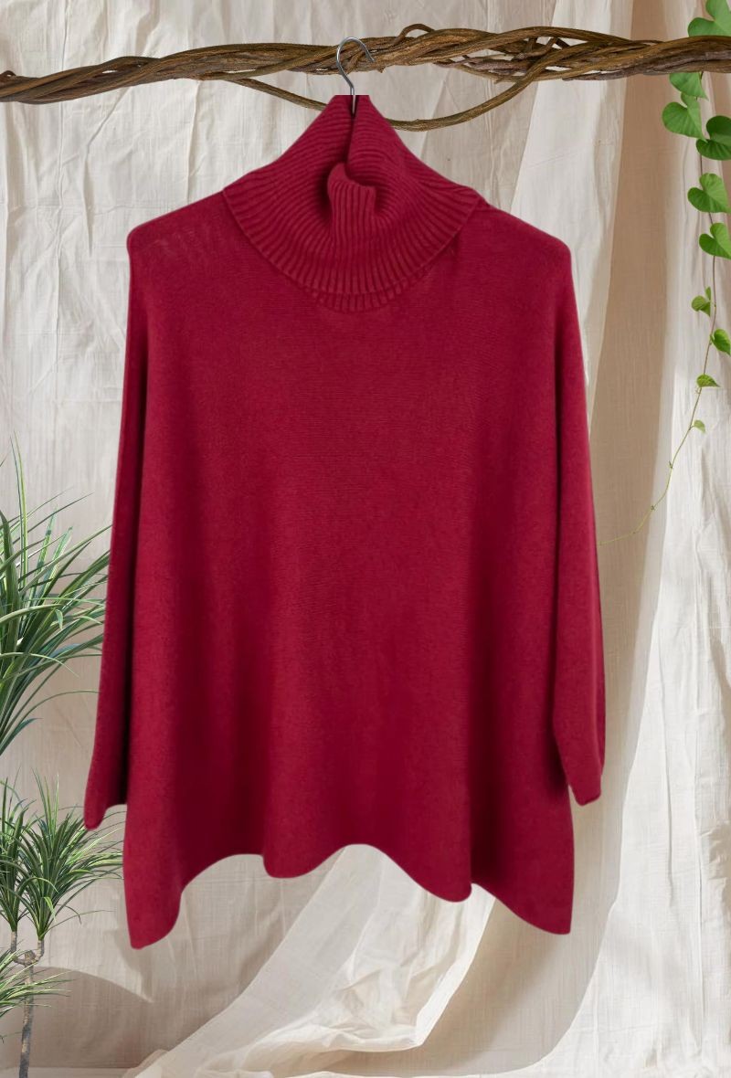Jersey de punto liso con corte cuadrado y estilo oversize, cómodo, versátil y favorecedor. Cuello alto pero no apretado.
