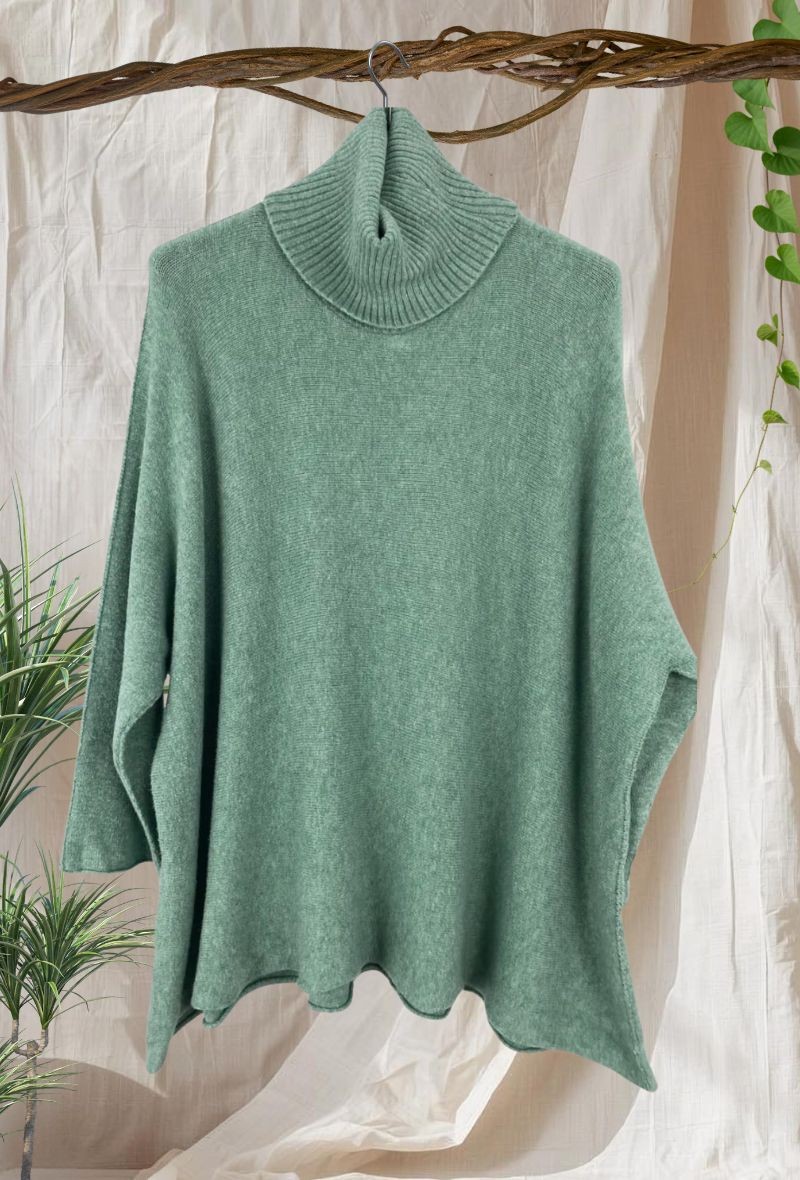 Jersey de punto liso con corte cuadrado y estilo oversize, cómodo, versátil y favorecedor. Cuello alto pero no apretado.