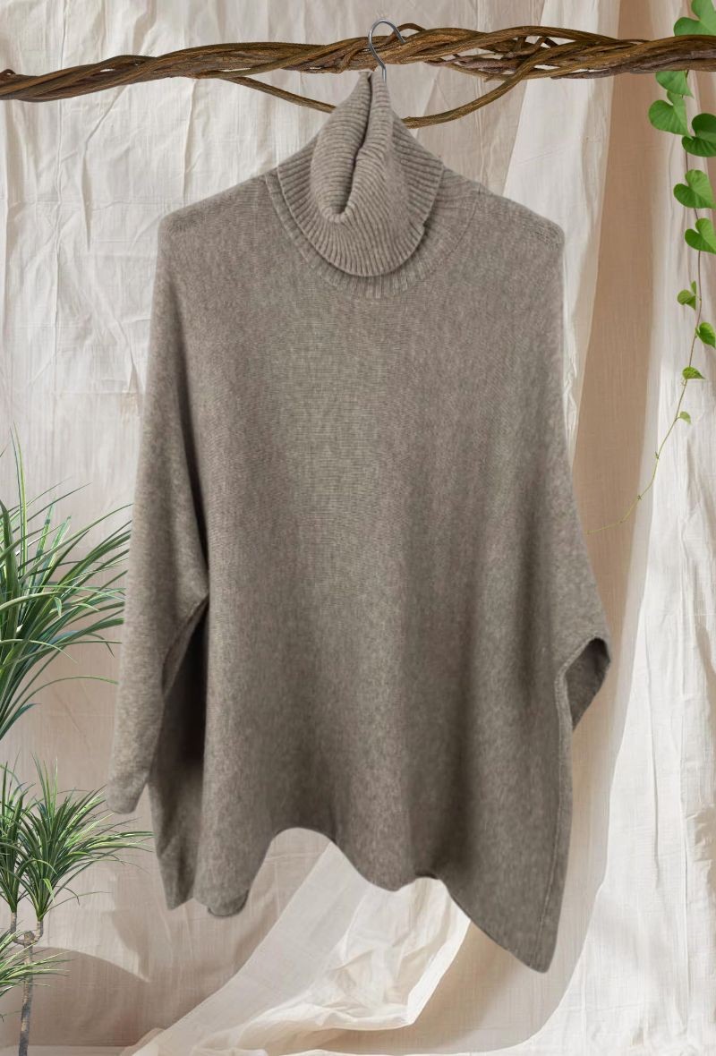 Jersey de punto liso con corte cuadrado y estilo oversize, cómodo, versátil y favorecedor. Cuello alto pero no apretado.