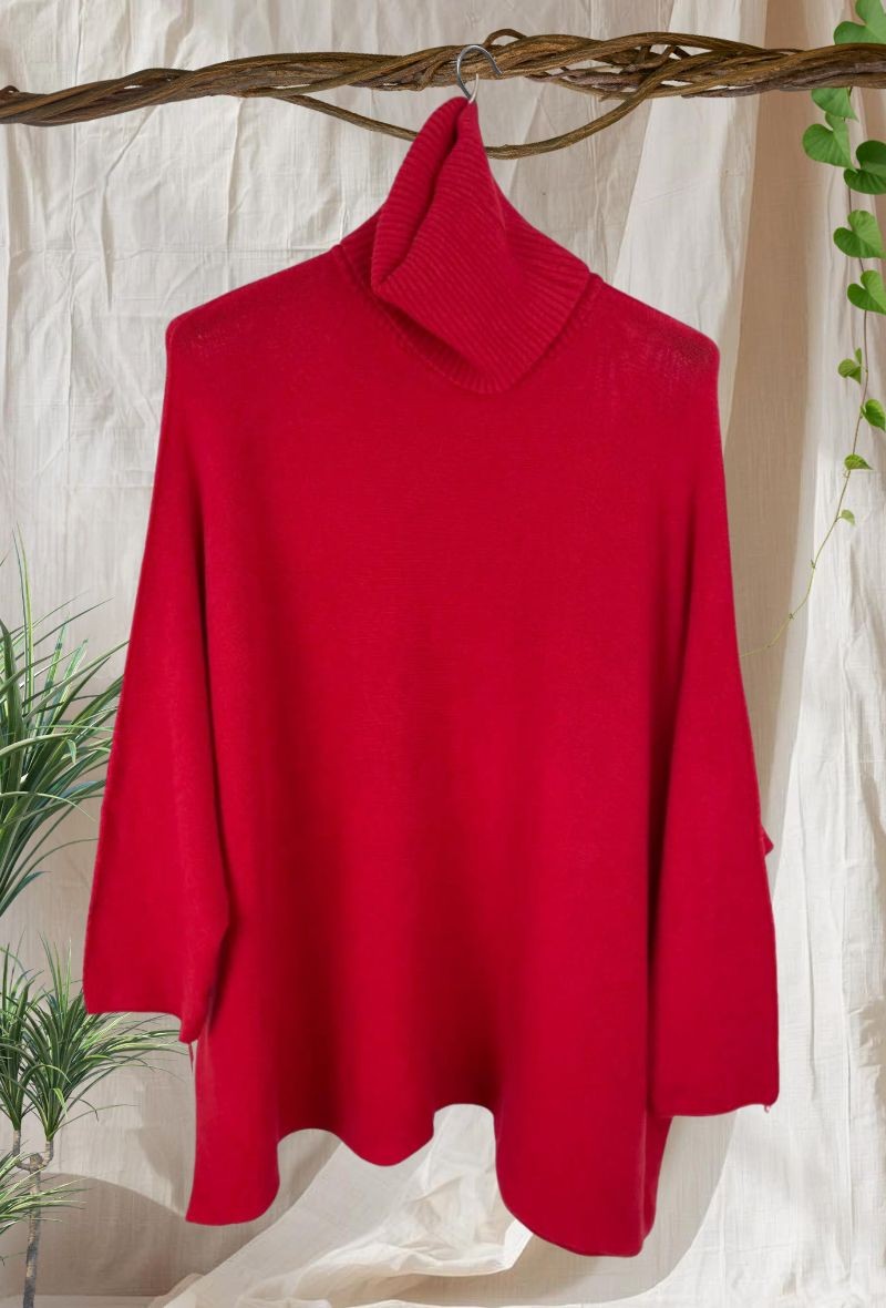 Jersey de punto liso con corte cuadrado y estilo oversize, cómodo, versátil y favorecedor. Cuello alto pero no apretado.