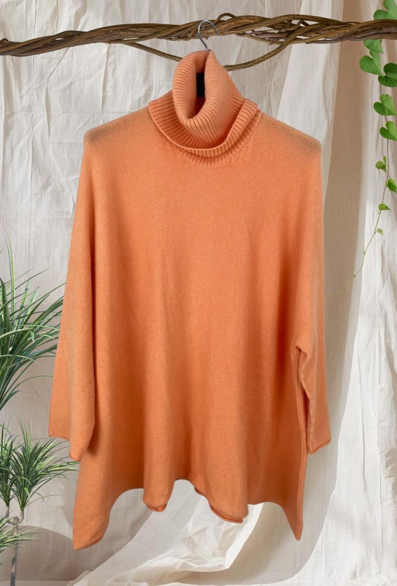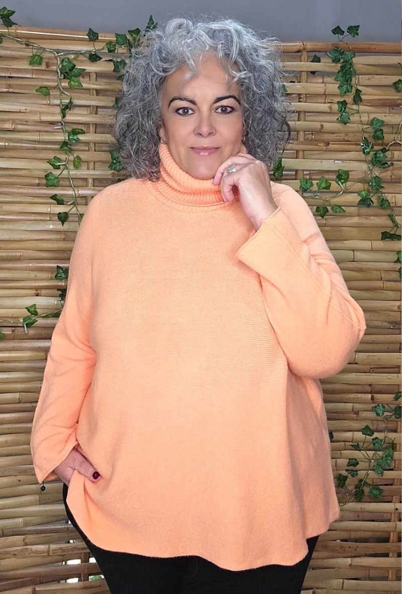 Jersey de punto liso con corte cuadrado y estilo oversize, cómodo, versátil y favorecedor. Cuello alto pero no apretado.
